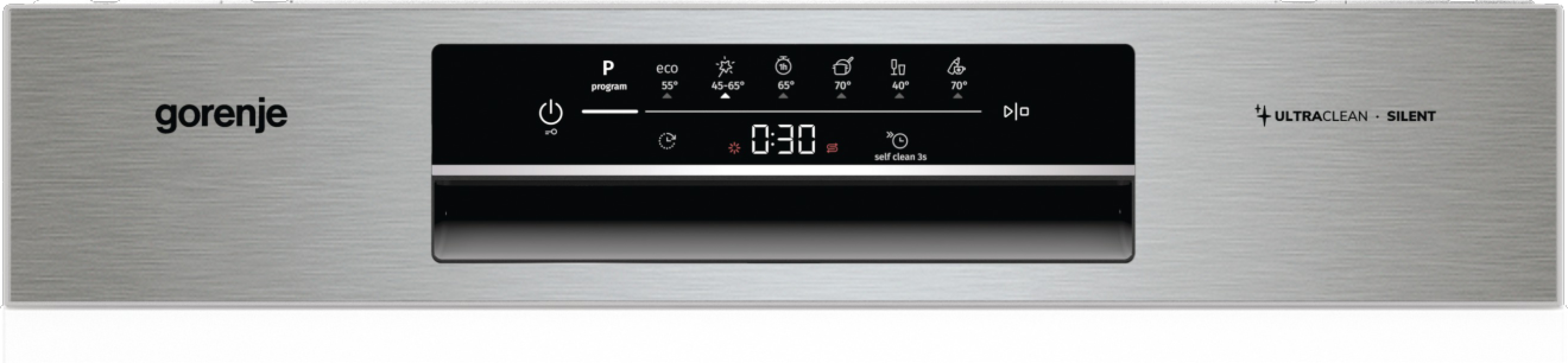 Das ergonomisch geformte Bedienfeld bietet hervorragende Sicht und Kontrolle über den Spülprozess und ausgewählte Einstellungen. Es ermöglicht die einfache Auswahl des richtigen Programms und andere spezielle Einstellungen.