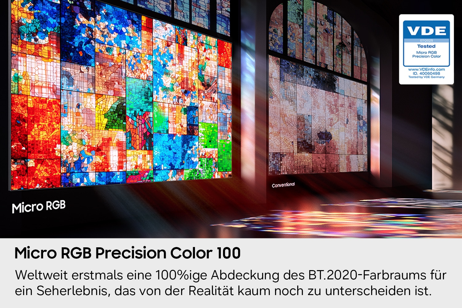Dank der Micro-RGB-Technologie und der Micro RGB AI Engine (R95H: Micro RGB AI Engine Pro) erreicht Micro RGB weltweit erstmals eine 100%ige Abdeckung des BT.2020-Farbraums. Dafür erhielt die Technologie als erste ihrer Art die Zertifizierung für „Micro RGB Precision Color“ von VDE[1]. Diese bestätigt eine besonders feine und präzise Farbsteuerung für ein Seherlebnis, das von der Realität kaum noch zu unterscheiden ist.