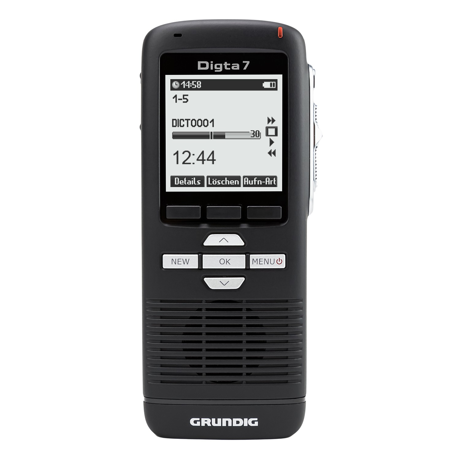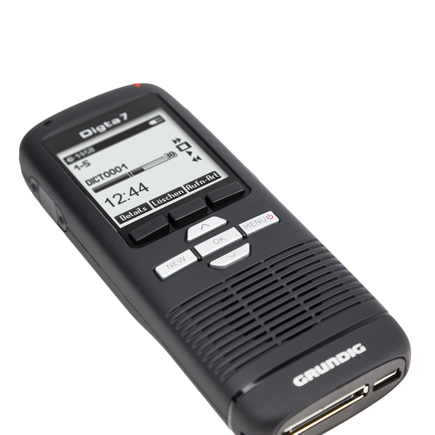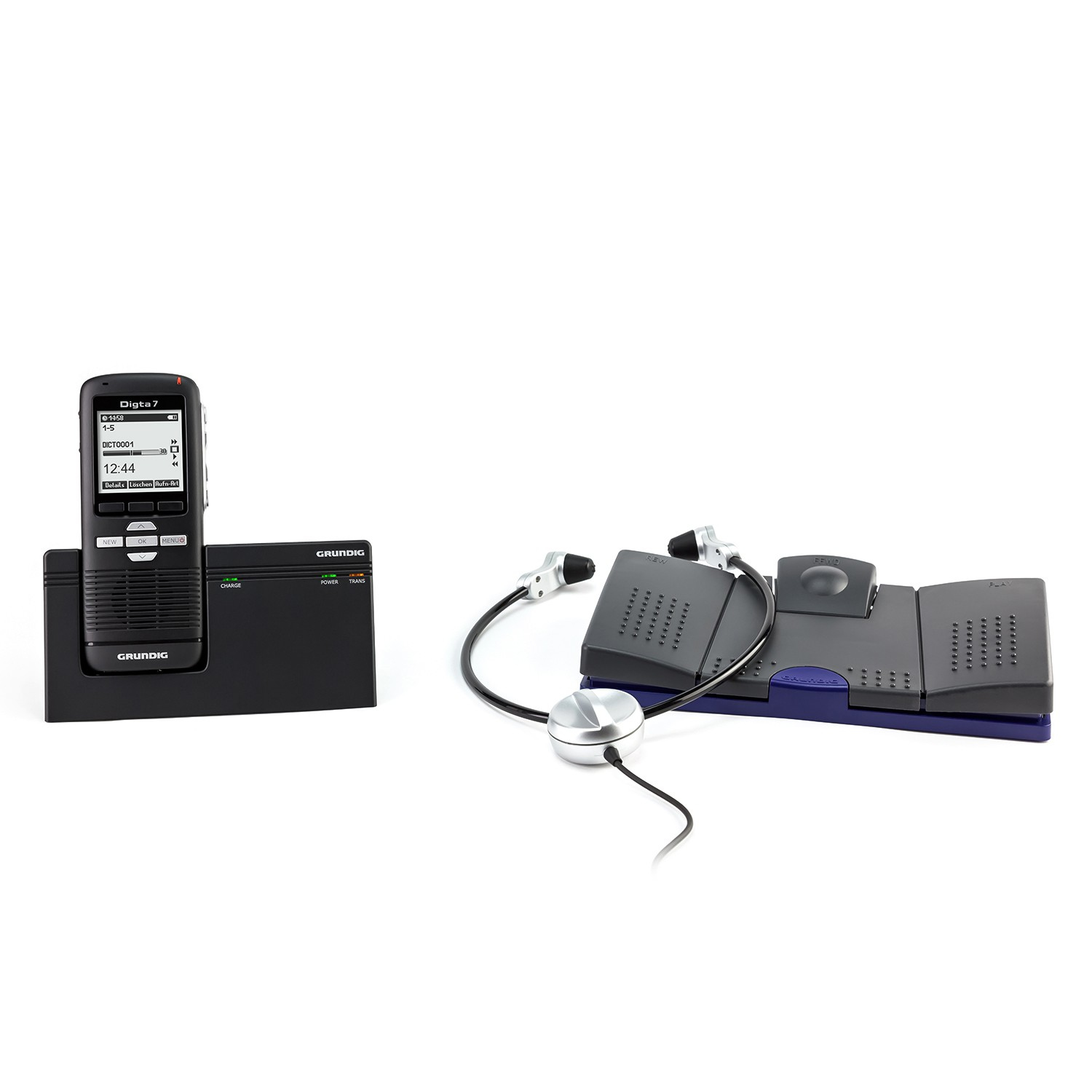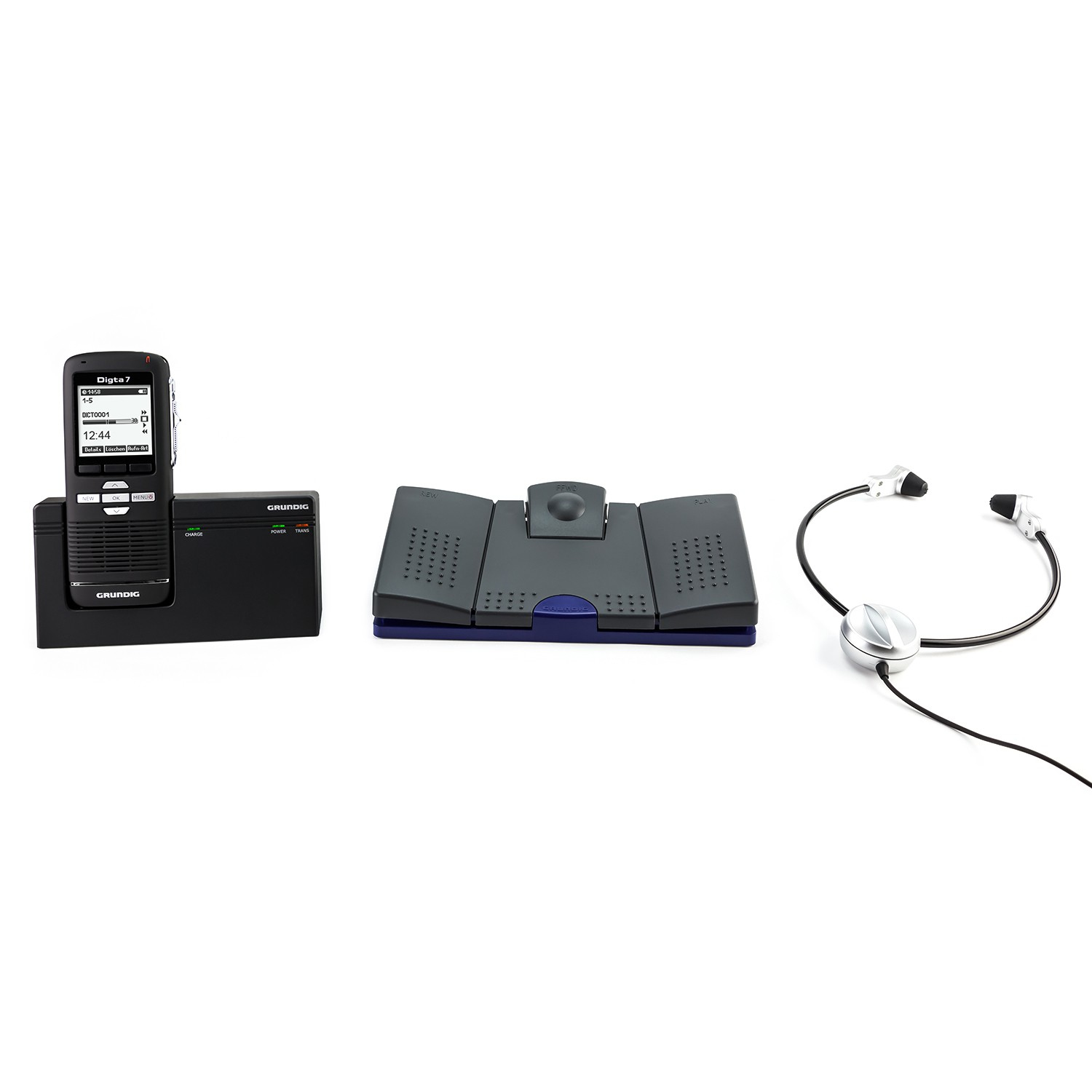 Ihre wichtigsten Aussagen ganz einfach aufnehmen - Mit dem Digta 7 Starter Kit mit DigtaSoft One von GRUNDIGMit dem Digta 7 Starter Kit mit DigtaSoft One von GRUNDIG erwerben Sie ein geniales Einsteigerpaket für Ihre digitalen Diktate. Dieses Einsteigerpaket besteht aus dem Diktiergerät Digta 7, dem Fußschalter Digta Foot Control 540 USB, dem Kopfhörer Digta Swingphone 568 Jack und der Software DigtaSoft One, die besonders leicht zu bedienen ist.Das Diktiergerät Digta 7!Es wurde für den mobilen Einsatz entwickelt und ist deshalb extrem robust und Schock absorbierend. Zudem hat es ein ergonomisches Design, passt in jede Tasche und das hintergrundbeleuchtete LCD-Display lässt sich trotz direkter Sonneneinstrahlung gut ablesen. Der 2 GB interne Speicher dieses digitalen Diktiergerätes sorgt für eine Aufnahmekapazität von 300 Std. (DSS), die mit einer externen Digta Card sogar noch erweitert werden kann. Das hierbei verwendete Aufnahmeformat DSS/DSSPro liefert Ihnen beste Klangqualität, besonders nützlich bei der Spracherkennung und höchste Sicherheitsstandards werden durch PIN/PUK, Diktatverschlüsselung und UUID (Universal Unique Identifier) geboten. Das Besondere daran: Die Diktierfunktionen des Digta 7 können auf dem Schiebeschalter nach Ihrem Geschmack belegt werden und Diktate können Sie schnell zu Ihrer Schreibkraft senden.Mittels Software automatisch das Diktierte empfangenEmpfangen Sie das Diktierte automatisch mithilfe der Software DssMover oder DssMover Portable.Mit den Füßen steuern!Der Fußschalter Digta Foot Control 540 USB ist ein hochwertiges Steuergerät mit drei Tasten, welche mit den Funktionen Start/Stopp, Schnellvorlauf und Schnellrücklauf belegt sind. Angeschlossen wird dieser Fußschalter einfach per USB an Ihren PC oder das Notebook.Bequem das Diktierte abhören!Der Kopfhörer Digta Swingphone 568 Jack hat einen Unterkinnbügel, welcher sich mithilfe eines Stellrades individuell an die Größe Ihres Kopfes anpassen lässt. Zudem haben Sie die Wahl zwischen drei verschiedenen Paar Ohrpolstern aus Silikon und Schaumstoff.Lieferung inkl. Netzteil 477, Akkupack 962, USB-Kabel, Etui, Handschlaufe, Fußschalter 540 USB, Swingphone 568 Jack, Lizenz für einen User für PC-Software DigtaSoft One.