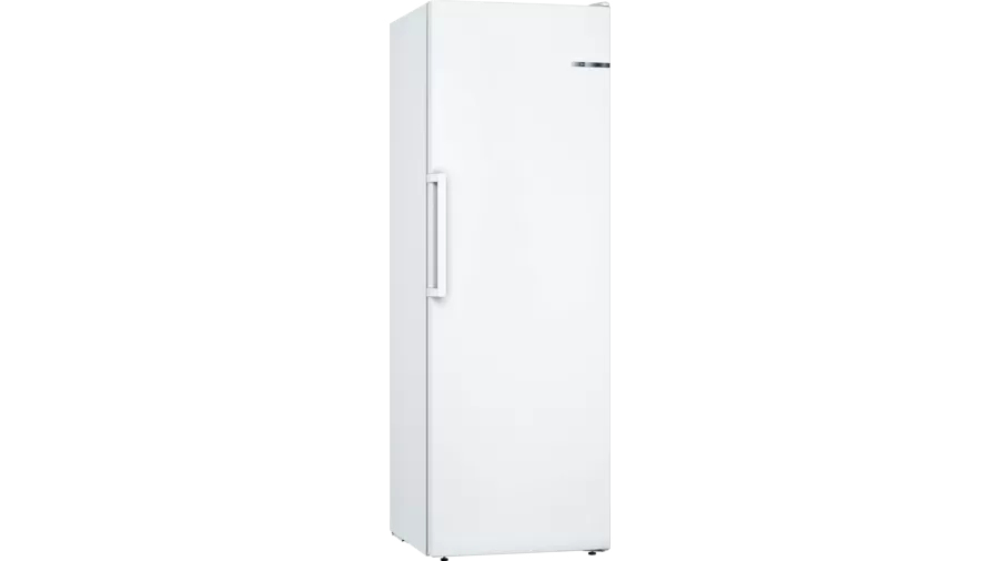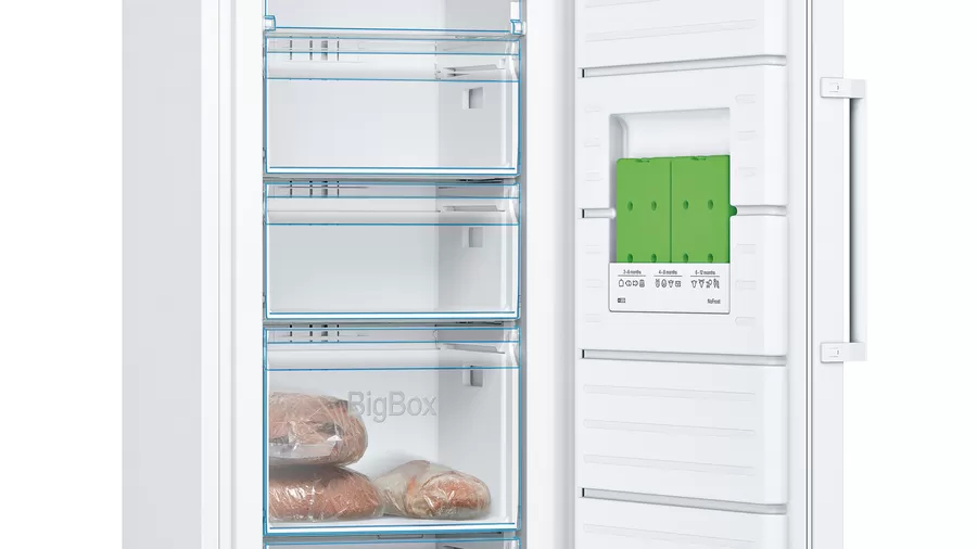 GSN33FWEV weiß NoFrost, Solo-Stand-Gefrierschränke (> 90 cm Höhe) Leistung und Verbrauch Energieeffizienzklasse: E Nutzinhalt gesamt: 225 l Nutzinhalt Kühlfächer: 0 l Nutzinhalt Tiefkühlfächer: 225 l Gefriervermögen in 24 Std.: 19 kg Energieverbrauch / Jahr: 229 kWh/a Klimaklasse: SN-T SuperGefrieren: ja Geräuscheffizienzklasse / Geräusch-Wert: C / 39 dB Temperature rise time : 9 h Design Türen weiß, Seitenwände weiß Vertikaler Stangengriff Komfort und Sicherheit NoFrost - nie wieder abtauen! Elektronische Temperaturregelung über LED ablesbar Optisches und akustisches Warnsignal bei Temperaturanstieg FreshSense - Konstante Temperatur durch intelligente Sensortechnik Super Gefrieren mit Eingefrierautomatik Gefrierteil VarioZone: herausnehmbare Sicherheitsglasablagen für eine flexible Nutzung des Gefrierraums 5 transparente Gefriergut-Schubladen, davon 1 BigBox Maße Gerätemaße ( H x B x T): 176.0 cm x 60.0 cm x 65.0 cm Technische Informationen Türanschlag rechts, wechselbar Höhenverstellbare Füße vorne, Rollen hinten Türöffnungswinkel 90° 220 - 240 V Zubehör 2 x Kälteakku, 1 x Eiswürfelschale