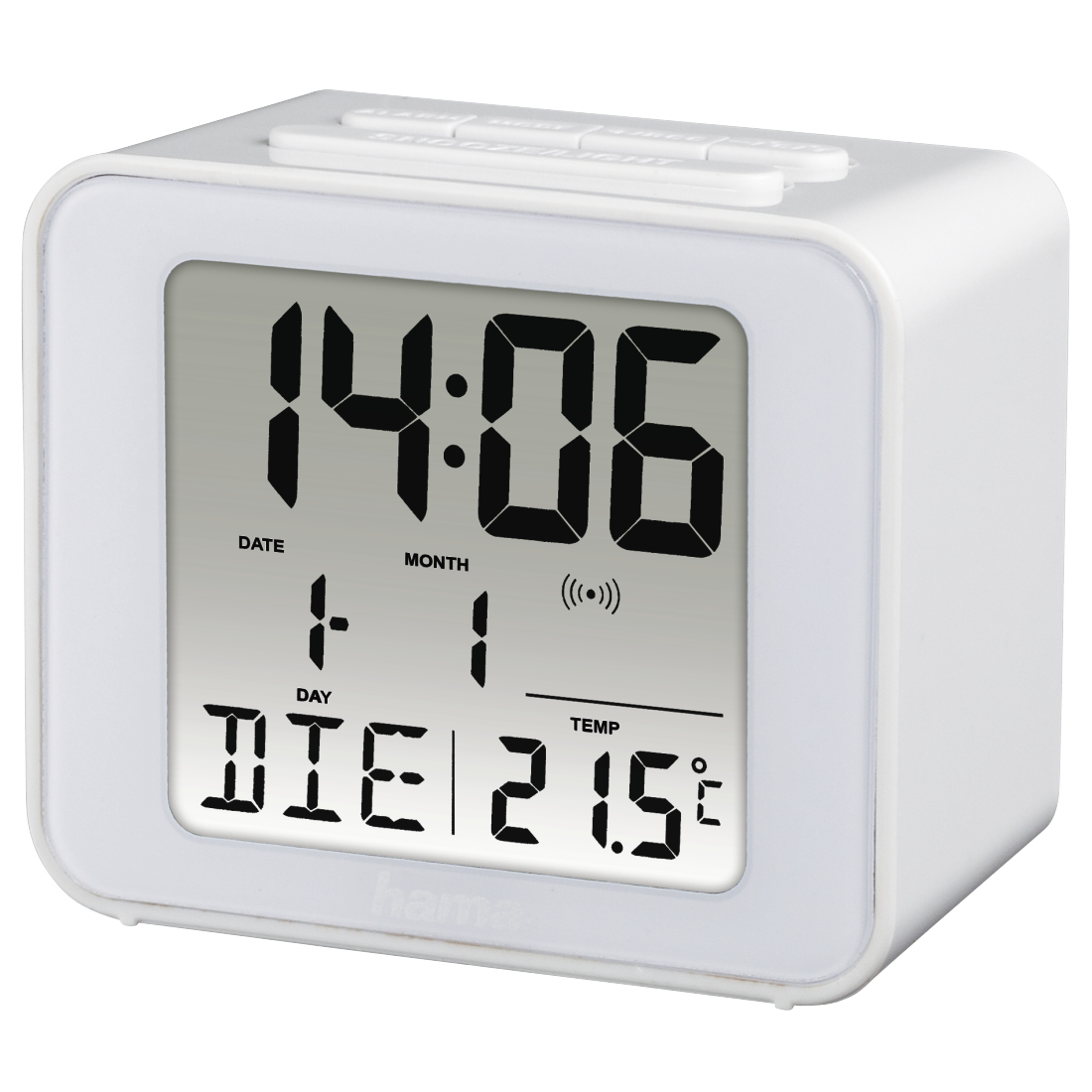 rnDCF-Funkuhr mit automatischer Zeitanpassung an die genaueste Uhr der WeltrnDie Zeitzone lässt sich manuell einstellen, wenn sich die DCF-Zeit von der der Zeitzone unterscheidetrnSpeed-Alarm weckt Schlafmützen mit zunehmendem Weckton-TempornUhr-/Kalender-/Weckfunktion:rneine Weckzeit programmierbarrnmit SchlummerfunktionrnDatumsanzeige (Tag/Monat)rnWochentaganzeige (7 Sprachen: Englisch, Deutsch, Italienisch, Französisch, Spanisch, Niederländisch, Dänisch)rnThermometer:rnumschaltbar zwischen Grad Celsius und Grad FahrenheitrnDCF-Funkuhr mit digitaler Anzeige von Uhrzeit, Weckzeit, Datum und Temperaturrnangenehme LED-Hintergrundbeleuchtungrngroße Displayanzeige für einfaches Ablesen der Uhrzeitrndank der handlichen Größe eignet sich der Wecker perfekt für Reisenrnrn Hauptmerkmale rn rn Technische Details rn Typ Digitale Tischuhr rn Produktfarbe Weiß rn Formfaktor Rechteckig rn Thermometer Ja rn Wecker Ja rn Gehäusematerial Kunststoff rn