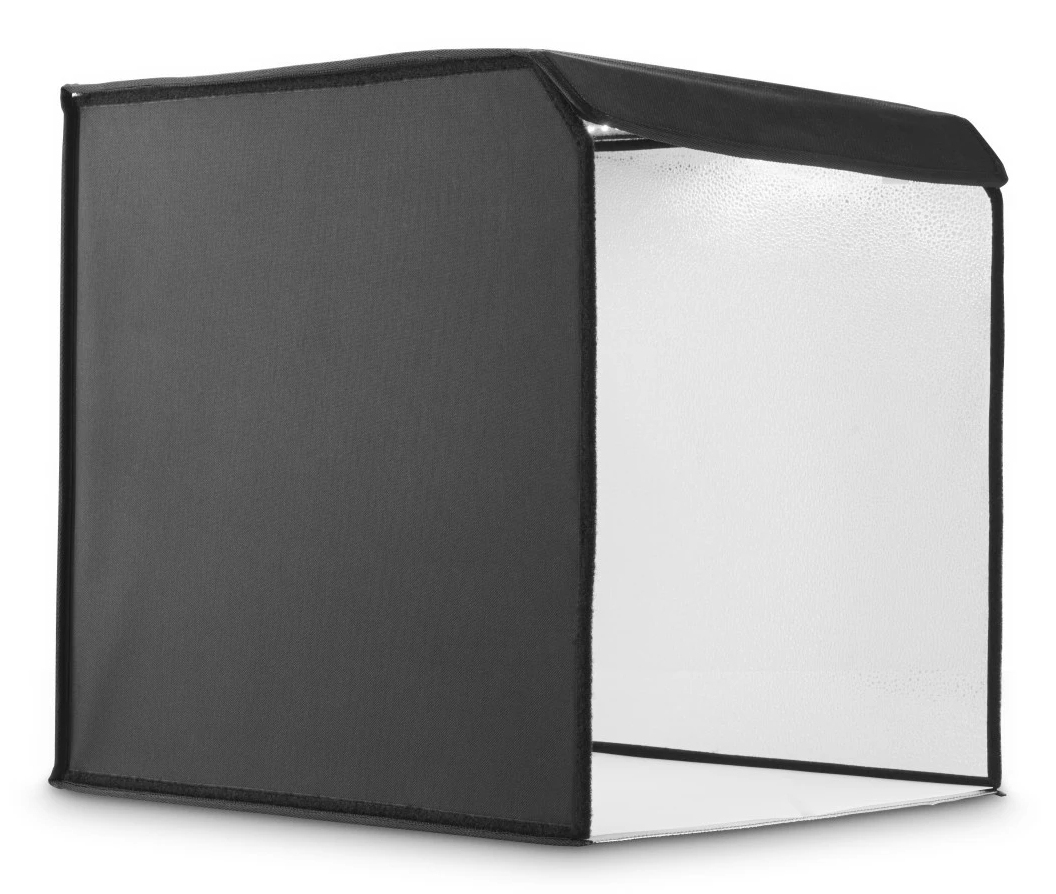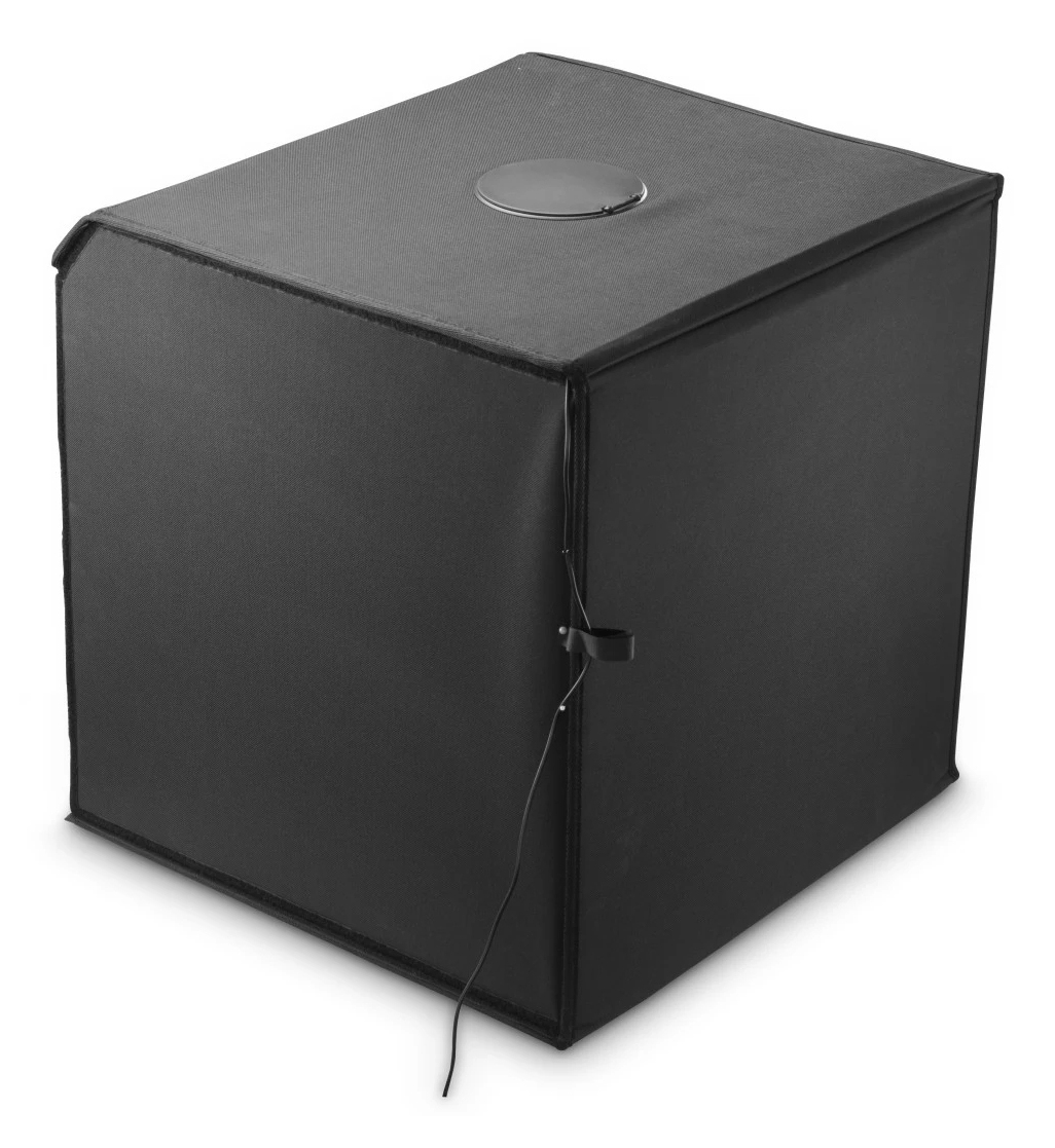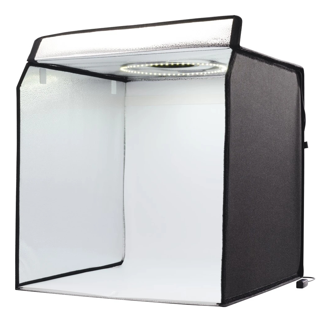 gute Ausleuchtung: integrierte Ringbeleuchtung mit 10,2" (ø 25 cm) und 128 LEDs an der Oberseite des Lichtwürfels