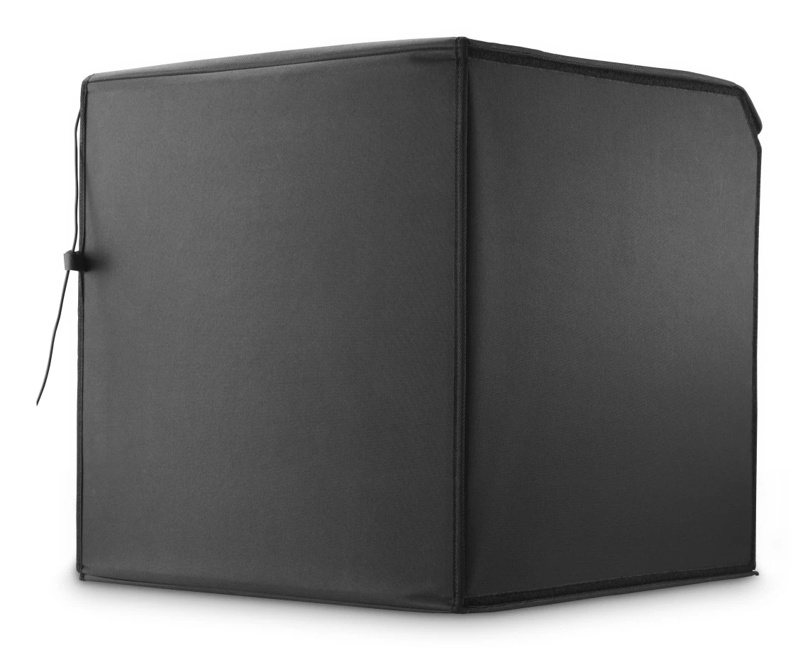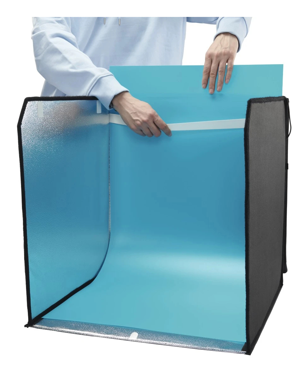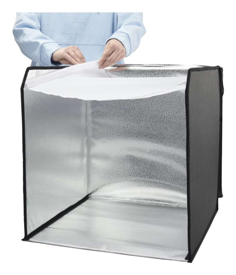 gute Ausleuchtung: integrierte Ringbeleuchtung mit 10,2" (ø 25 cm) und 128 LEDs an der Oberseite des Lichtwürfels