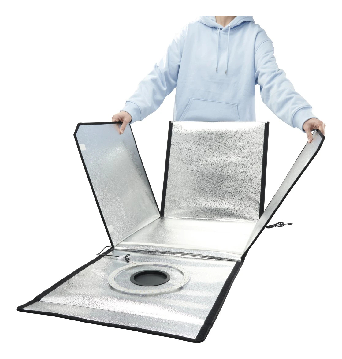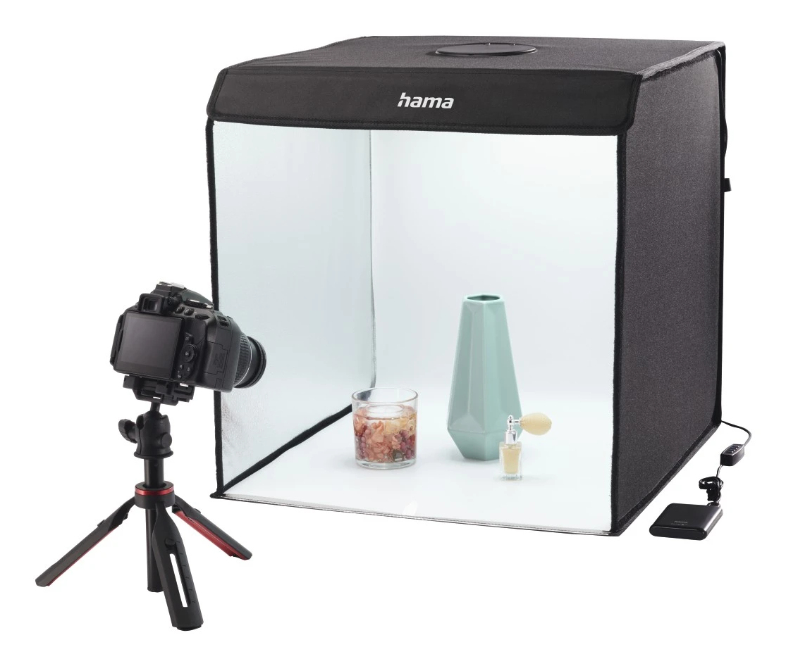 perfekt ausgeleuchtet und schnell auf- und abgebaut, wo Sie wollen: mobiles Fotostudio mit LED-Ringbeleuchtung im Reiseformat für perfekte Lichtverhältnisse für Produktfotografie, ideal z.B. für Produktbilder in der Office-Präsentation, im eigenen Onlineshop oder z.B. auf eBay, Amazon, Etsy etc