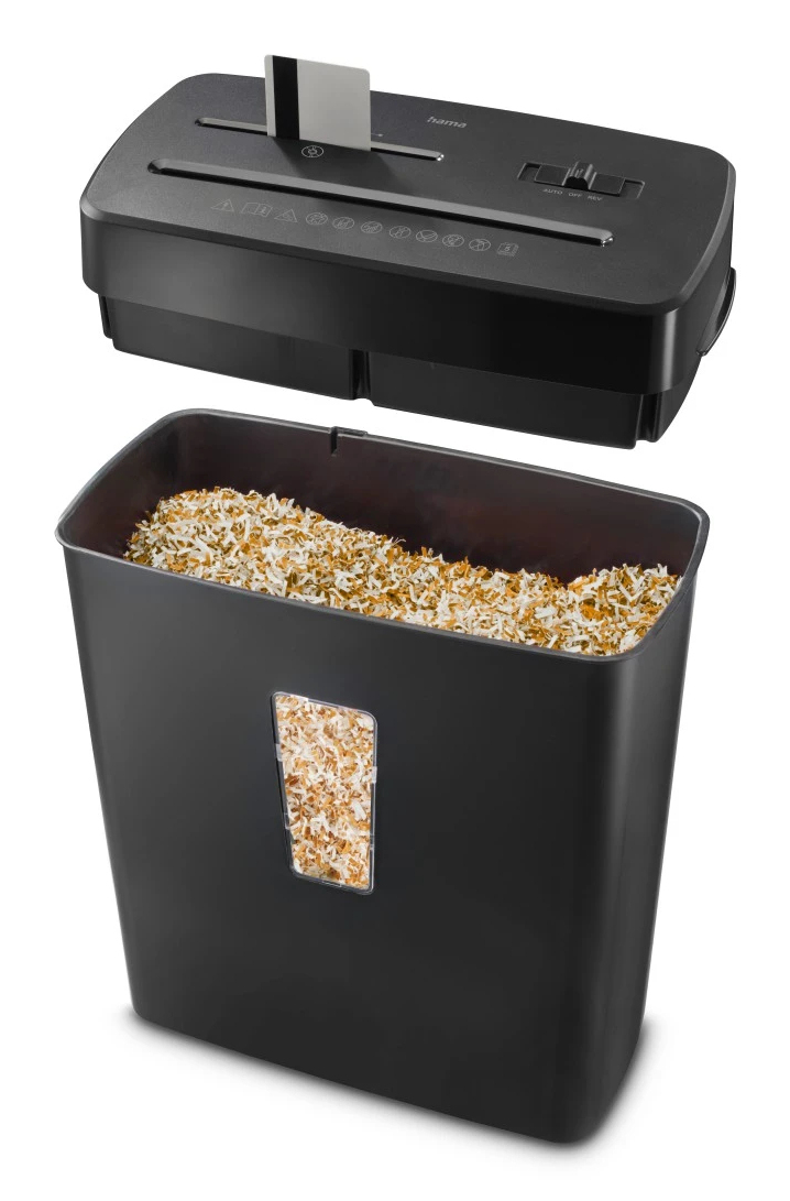 Mit dem hama Aktenvernichter mit Partikelschnitt Prime M50CD-B vernichten Sie vertrauliche Unterlagen besonders sicherMit dem hama Aktenvernichter mit Partikelschnitt Prime M50CD-B gehen Sie immer auf Nummer Sicher, wenn Sie sensible Dokumente oder Unterlagen bis zum DIN A4 Format unkenntlich machen und vernichten möchten.Was sind die Vorteile des Mikro-Partikelschnitts?Der Mikro-Cut zerteilt Papier in äußerst kleine Stücke – weit kleiner als bei Standard-Partikelschnittarten –, wodurch ein Nachvollziehen der ursprünglichen Inhalte faktisch ausgeschlossen ist. Es werden Mikro-Partikel in einer Größe von 2 x 12 mm erzeugt.Was bedeutet die Sicherheitsstufe P-5?Mit diesem Gerät werden Dokumente nach DIN 66399 Sicherheitsstandard P-5 geschreddert. Somit bietet es einen extrem hohen Schutz für besonders sensible und geheime Daten.Der perfekte Partner fürs HomeofficePro Arbeitsgang kann das Gerät bis zu 5 Blatt mit einem Papiergewicht von jeweils 80 g/qm zerschneiden. Für eine leichte Entsorgung der Überbleibsel sorgt der 13,0 l große Auffangbehälter. Er ist nicht besonders groß, was das Gerät kompakt und handlich macht. Wenn Sie für Ihr Homeoffice oder den privaten Gebrauch einen zuverlässigen Helfer suchen, dann sind Sie damit definitiv gut ausgestattet.Diese Besonderheiten zeichnen das Produkt ausDas macht dieses Modell besonders: Separates Schneidewerk für CDs / DVDs. Sicherheitseinrichtung verhindert den Betrieb, sobald der Gerätekopf nicht ordnungsgemäß in den Papierkorb eingelegt ist..hama – Qualitätsanspruch trifft auf benutzerorientierte EntwicklungDie Marke hama steht seit Jahrzehnten für vielseitige Technikprodukte, die durch ihre Alltagstauglichkeit überzeugen. Mit Fokus auf benutzerorientiertes Design und ein gutes Preis-Leistungs-Verhältnis entwickelt hama Geräte, die moderne Arbeitsumgebungen optimal unterstütze, darunter auch effiziente, kompakte Aktenvernichter.Vernichtet auch optische und magnetische DatenträgerAus langlebigem Stahl gefertigt, schreddern die scharfen Schneidemesser alles, was ihnen in die Quere kommt. Das Schneidwerkzeug verwandelt nicht nur Dokumente und Unterlagen in kleine Stücke, auch Kreditkarten kann es problemlos schreddern. So können Sie auch die Daten von optischen bzw. magnetischen Datenträgern unwiederbringlich zerstören.Wichtiges auf den Punkt gebrachtWeitere interessante Produkteigenschaften dieses Modells sind: RücklauffunktionStart-/StoppautomatikÜberhitzungsschutzvernichtet CDs/DVDsvernichtet Heftklammernvernichtet KreditkartenSichtfensterAuf der Suche nach einem geeigneten Bürobegleiter? Mit dem hama Aktenvernichter mit Partikelschnitt Prime M50CD-B liegen Sie richtig, wenn Sie gelegentlich Dokumente unkompliziert und schnell vernichten möchten.