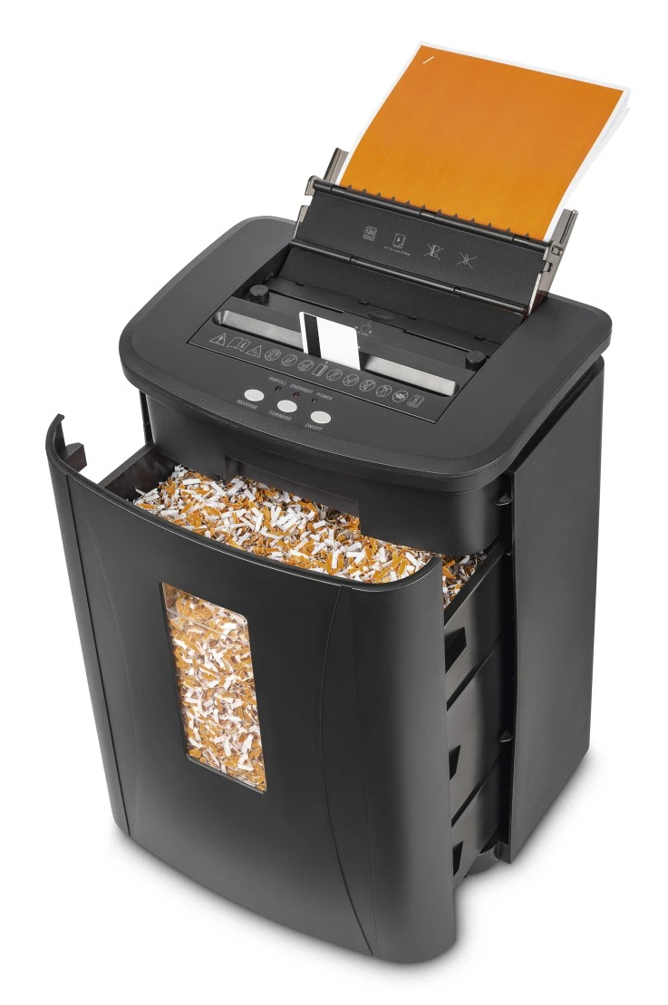 Bietet Schutz vor unbefugtem Zugriff auf sensibles Datenmaterial: der hama Aktenvernichter mit Partikelschnitt Safe Auto M1200Der hama Aktenvernichter mit Partikelschnitt Safe Auto M1200 zerkleinert zuverlässig Dokumente, die vertrauliche Daten enthalten und die Sie unwiederbringlich vernichten möchten. Das Gerät punktet im Gebrauch durch seine einfache Bedienbarkeit und praktischen Funktionen.Was bedeutet die Sicherheitsstufe P-4?Ihre Dokumente werden nach DIN 66399 Sicherheitsstandard P-4 vernichtet. Somit gewährleistet das Exemplar ein hohes Maß an Datenschutz. Dank der Sicherheitsstufe P-4 eignet es sich optimal für die zuverlässige, datenschutzkonforme Vernichtung sensibler Dokumente, z. B. Personalakten oder Verträge.Was für Vorteile hat der Mikro-Partikelschnitt?Durch den feinen Mikro-Partikelschnitt ist eine Rekonstruktion der Dokumente praktisch ausgeschlossen. Dieses Verfahren übertrifft den klassischen Streifenschnitt in puncto Sicherheit und eignet sich daher ideal für professionelle Arbeitsbereiche. Beim Mikro-Cut wird das Papier in winzige, kaum erkennbare Fragmente zerlegt – kleiner als beim herkömmlichen Partikelschnitt. Es werden Schnipsel in einer Größe von 4 x 20 mm erzeugt.Der perfekte Partner fürs HomeofficePro Arbeitsgang kann das Exemplar bis zu 120 Blatt mit einem Papiergewicht von jeweils 80 g/qm vernichten. Die zerschnittenen Überbleibsel Ihrer Dokumente und Unterlagen landen in einem 25,0-l-Auffangbehälter. Wenn Sie für den privaten Gebrauch oder das Homeoffice einen zuverlässigen Helfer suchen, dann sind Sie damit definitiv bestens gerüstet.Macht auch vor Kreditkarten nicht HaltDie scharfen Schneidewalzen sind aus Stahl hergestellt und dadurch überaus robust und langlebig. Das Schneidwerk verwandelt nicht nur Dokumente und Unterlagen in kleinste Teile, auch Kreditkarten fallen ihm zum Opfer.Für ein angenehmes Arbeitsumfeld: 60 dB (A) leiseMit gerade einmal 60 dB (A) zählt dieses Gerät zu den leisen Exemplaren und verhindert, dass lästige Betriebsgeräusche den Arbeitsablauf stören. Das entspricht in etwa dem Dezibelwert einer normalen Unterhaltung.Aus dem Hause hamahama gehört zu den bekanntesten deutschen Marken für Elektronik- und Büro-Zubehör. Das Unternehmen überzeugt durch ein breites Sortiment, innovative Ideen und solide Qualität. hama entwickelt Produkte, die den Alltag erleichtern und moderne Technik mit praktischen Lösungen verbinden.Mit vielen praktischen FunktionenWeitere interessante Produkteigenschaften dieses Modells sind: mit RollenRücklauffunktionStart-/StoppautomatikÜberhitzungsschutzvernichtet Heftklammernvernichtet KreditkartenSichtfensterAutofeedAuf der Suche nach dem perfekten Bürobegleiter? Mit dem hama Aktenvernichter mit Partikelschnitt Safe Auto M1200 liegen Sie richtig, wenn Sie eine praktische Lösung fürs Homeoffice benötigen und Dokumente einfach und sicher entsorgen möchten.