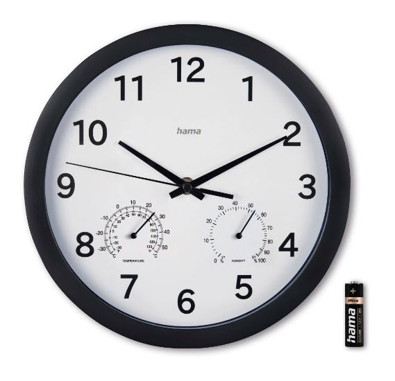 Tick – Tack – Trend – die hama Wanduhr Malta weiß schwarz Kunststoff, Ø 25,0 cmZeitlos elegant: die hama Wanduhr Malta ist mehr als nur ein Accessoire, sie ist ein Statement für Ihren individuellen Stil. Gut platziert kann sie dazu beitragen, Pünktlichkeit zu fördern, da Sie konstant einen visuellen Hinweis auf die aktuelle Zeit erhalten. Das macht es einfacher, Termine einzuhalten und Verpflichtungen rechtzeitig zu erfüllen.Alles zum UhrwerkDas Modell besitzt ein Quarzuhrwerk. Da Quarzkristalle stabiler schwingen und weniger von Umgebungsbedingungen beeinflusst werden, ist diese Art der Zeitmessung wesentlich präziser als rein mechanische Ausführungen.Schöne OptikDie Optik und die verwendeten Materialien spielen bei diesem Gegenstand eine große Rolle, denn er soll zu seiner Umgebung passen. Das Gehäuse ist rund und besteht aus schwarzem Kunststoff. Die Zahlen auf weißem Grund kann man sehr gut sehen, sodass Sie die Uhrzeit sofort erfassen. Ein Zifferblatt mit Zahlen ist sehr benutzerfreundlich. Es ermöglicht eine einfache Ablesung der Stundenpositionen. Auch für Kinder, die lernen die Uhr zu lesen, sind die Zahlen wichtig. Die Sichtscheibe besteht aus hochwertigem Glas.Komfort geht vorDiese hilfreichen Eigenschaften besitzt die hama Wanduhr Malta: Hygrometer, Sekundenzeiger, Temperaturanzeige, Wandmontage. Der Gehäusedurchmesser beträgt 25,0 cm.Zuverlässig und zeitlos schönNutzen Sie die praktische hama Wanduhr Malta weiß schwarz Kunststoff, Ø 25,0 cm für mehr Komfort und Effizienz im Alltag.