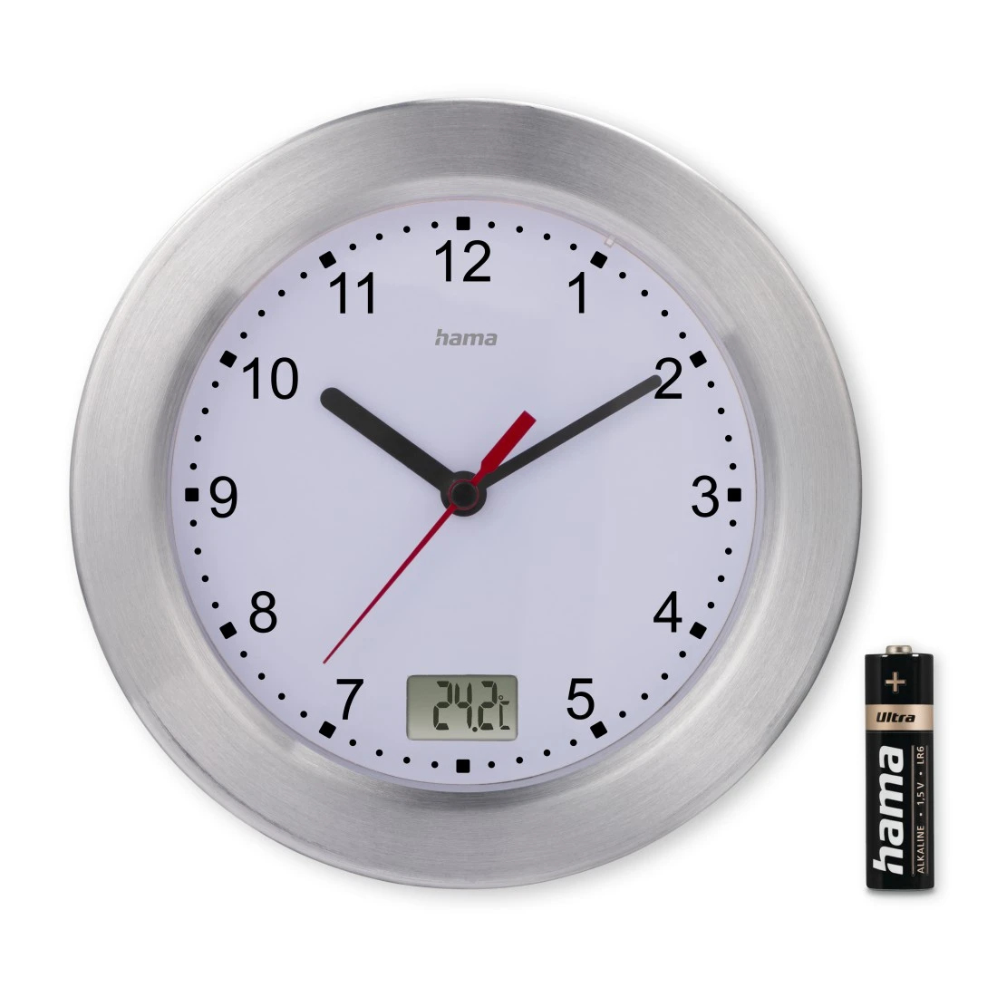 Die hama Wanduhr Mauritius weiß silber Aluminium gebürstet, Ø 17,0 cm: Folgen Sie dem ZeitgeistZeitmanagement in einem ästhetischen Rahmen erhalten Sie mit der hama Wanduhr Mauritius. Das zuverlässige Uhrwerk sorgt für eine genaue Zeitanzeige, damit Sie den ganzen Tag über pünktlich und organisiert sind.Welche Mechanik hat das Uhrwerk?Das Modell verfügt über ein Quarzuhrwerk. Im Gegensatz zu rein mechanischen Uhrwerken hat das Quarzuhrwerk nur Gangabweichungen von wenigen Sekunden pro Monat und ist dadurch wesentlich exakter.Design, das funktioniert!Das Aussehen und die verwendeten Materialien sind bei diesem Produkt wichtig, denn es soll zu seiner Umgebung passen. Das Gehäuse ist rund und besteht aus Aluminium gebürstet. Die Zahlen auf weißem Grund kann man sehr gut sehen, sodass Sie die Uhrzeit auf den ersten Blick erfassen. Dank der Zahlen auf dem Ziffernblatt haben Sie eine schnelle Orientierung, denn damit ist es einfach, die Uhrzeit abzulesen.Was die hama Wanduhr Mauritius so speziell machtDiese hilfreichen Eigenschaften besitzt die hama Wanduhr Mauritius:SekundenzeigerTemperaturanzeigeWandmontageDes Weiteren gibt es folgende Besonderheit: Befestigung mit Saugnäpfen. Der Gehäusedurchmesser beträgt 17,0 cm.Verpassen Sie keine Termine!Profitieren Sie von einer präzisen und zuverlässigen Zeitmessung mit der hama Wanduhr Mauritius weiß silber Aluminium gebürstet, Ø 17,0 cm und bestellen Sie sie gleich mit.