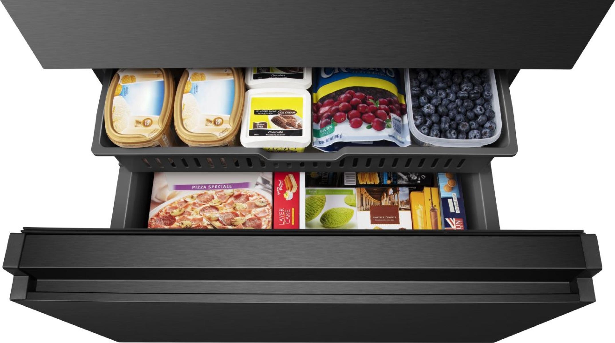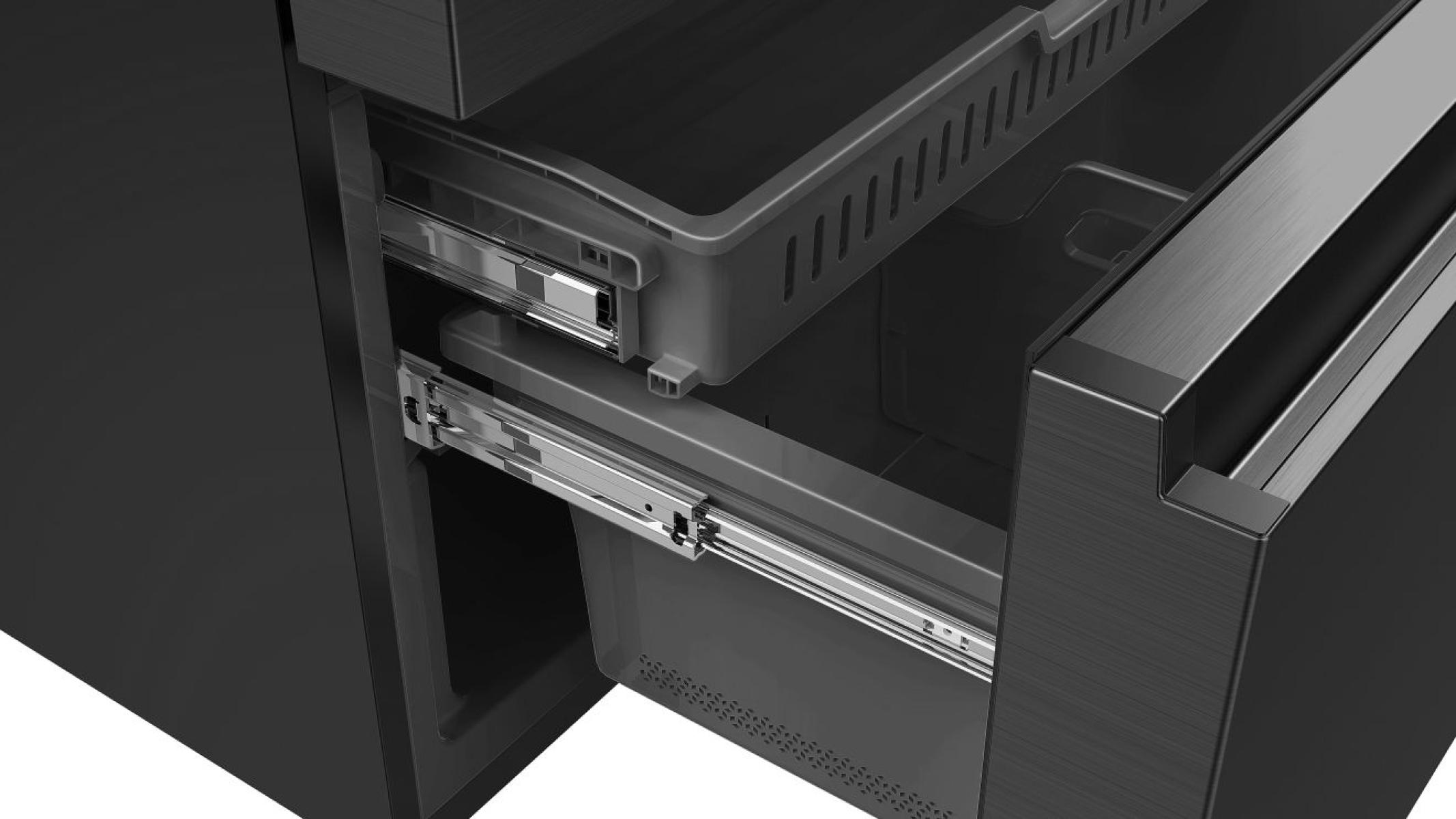 Die einfach gleitenden Metallführungen erleichtern das Ein- und Ausziehen der Schubladen, selbst wenn sie voll mit Lebensmitteln sind. Die großvolumigen Gefrierschubladen bieten ebenfalls Platz für große Kartons, darunter auch große Tiefkühlpizzen.