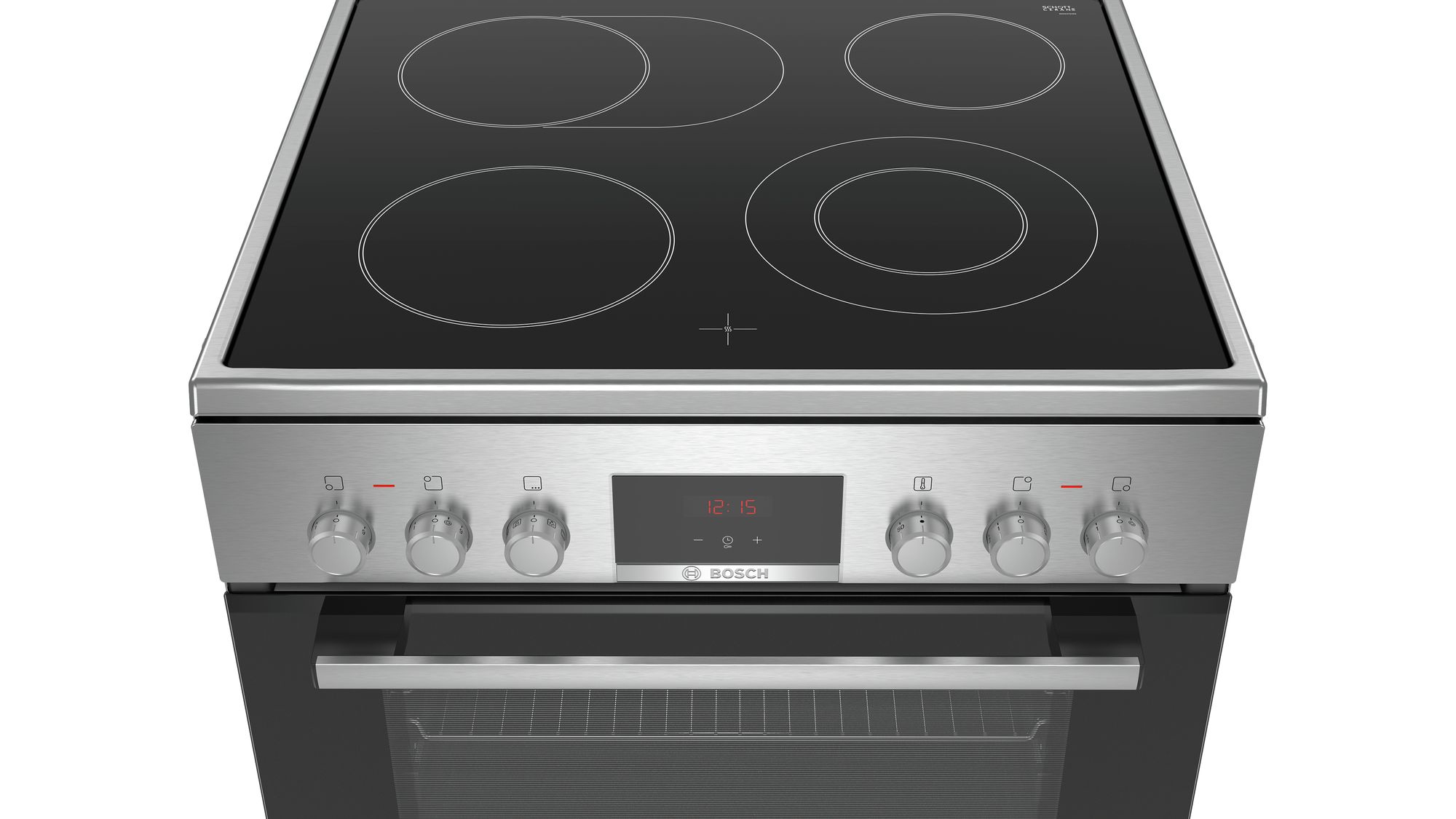 Bosch Elektroherd HKR39C250 Der HKR39C250 ist ein Elektroherd von Bosch. Das Innenraumvolumen ist auf 66 Liter ausgelegt und damit mittelgroß. Der Elektroherd besitzt 4 Kochzonen. Cleveres Zubereiten mit den richtigen Programmen Neben Ober-/Unterhitze und Unterhitze verwenden Sie die Backofeneinstellungen 3D-Heißluft und Schnellvorheizfunktion. Schmackhafte Krusten bilden sich unter Zuhilfenahme des Umluftgrills. Der italienische Klassiker wird auf der Pizzastufe unglaublich knusprig und lecker. Gut zu wissen Mit dem Teleskopauszug ziehen Sie das Backblech komfortabel auf einer Führungsschiene heraus. Aufgrund der katalytisch beschichteten Rückwand sparen Sie Aufwand und Zeit bei der Reinigung. Stand-Elektroherd m. Glasker.-Feld wird mit versenkbaren Schaltern bedient. Zeitfunktionen wie die Startzeitvorwahl sind von Vorteil, wenn bereits alles vorbereitet ist, das Gericht aber erst zu einem späteren Zeitpunkt erhitzt werden soll. 0,98 kWh bei Ober-/Unterhitze sowie 0,79 kWh bei Heißluft/Umluft verbraucht der HKR39C250. Der Elektroherd hat ein Gewicht von 50,6 kg und ist 60 cm breit, 85 cm hoch und 60 cm tief. Der Lieferumfang des HKR39C250 enthält 1 Grillrost und 1 Universalpfanne. Das über 100-jährige Unternehmen Bosch ist vor allem bekannt für Elektrowerkzeuge, Haushaltsgeräte und Automobiltechnik. Bestellen Sie mit nur wenigen Klicks in unserem Shop.