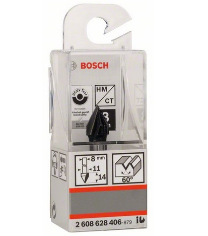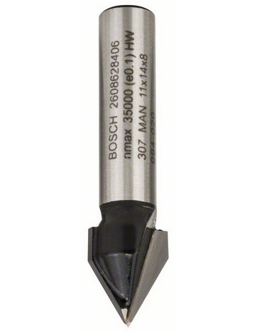 HM-V-Nutfräser, 8 mm Der Stundard für Holz V-Nutfräser besitzt eine hohe Schneidleistung für das Schneiden feiner Schriftzüge. Schneidekanten aus Wolframkarbid gewähren Haltbarkeit und zuverlässiges Schneiden Auch begrenzt das Design des Fräsers die Spangröße und vermeidet damit Rückschlag. Er ist bestimmt für das Schneiden schmaler dekorativer Ziernuten, feiner Schriftzüge sowie Fasen mit Seitenführung in weiches und hartes Massivholz sowie in Holzverbundstoffe. Er eignet sich für Handfräsen, tragbare Tischfräsen und CNC-Fräsen. Schaft mm: 8, Winkel Grad: 60, Durchmesser (D) mm: 11, Arbeitslänge (L) mm: 13,7, Gesamtlänge (G) mm: 45 - Breite: 3,6 cm, - Gewicht: 0,055 kg, - Höhe: 3,4 cm, - Länge: 10 cm