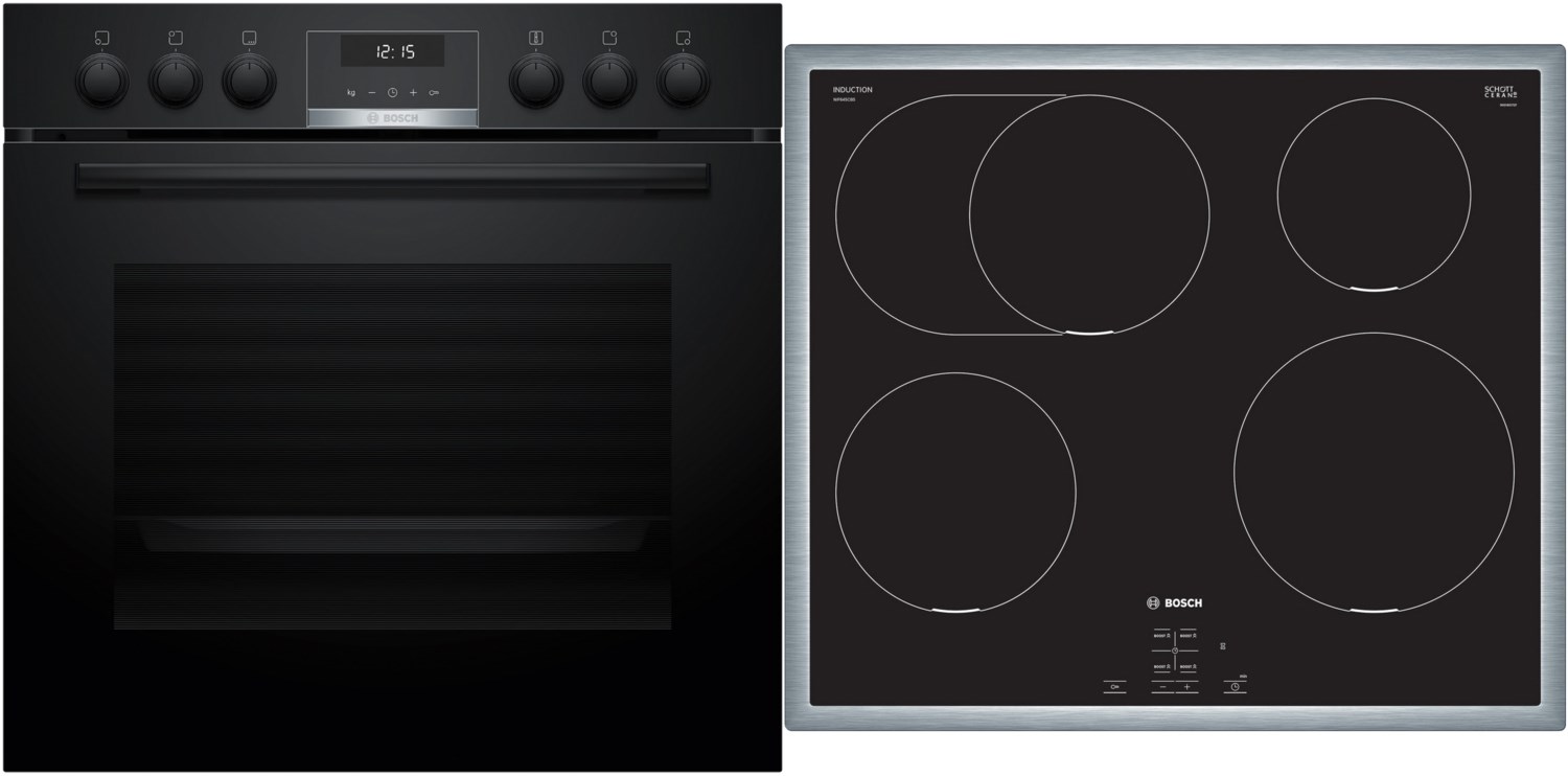 Einbau-Geräte-Set Bosch HND615LS67 Mit dem HND615LS67 bietet Bosch Ihnen ein Einbau-Geräte-Set, welches aus einem Einbauherd und einem Glaskeramikfeld besteht. Das sparsame Einbau-Geräte-Set verbraucht lediglich 0,94 kWh bei Ober-/Unterhitze sowie 0,69 kWh bei Heißluft/Umluft und hält die Kosten auf diese Weise gering. Der Backofen fasst 71 Liter und ist somit mittelgroß. Auf 4 Kochzonen bietet das Einbau-Geräte-Set Platz für Pfannen und Töpfe. So macht Kochen Spaß Dank der Induktionstechnologie besticht das Modell durch schnelle Hitzeerzeugung und extra viel Sicherheit, da nur die Töpfe erhitzt werden, die Glasplatte aber nicht gefährlich heiß wird. Ebenso tragen die Abschaltautomatik und die Kindersicherung zur sorglosen Haushaltsführung bei. Hier ist der Name Programm: Auf der Turbostufe erhitzt das HND615LS67 Speisen im Turbogang – schnell und effektiv. Potenzial für Kreativität Neben Ober-/Unterhitze und Unterhitze verwenden Sie die Backofeneinstellungen 3D-Heißluft und Schnellvorheizfunktion. Schmackhafte Krusten entstehen unter Zuhilfenahme des Umluftgrills. Mit der Pizzastufe wird die Creazione alla Casa knusprig. Das HND615LS67 steht Ihnen darüber hinaus mit den 10 Automatikprogrammen als smarter Küchenhelfer zur Seite. Gut zu wissen Bedient wird Einbau-Geräte-Set mit Induktion über versenkbare Schalter. Weil das Timing beim Kochen von großer Bedeutung ist, hat Bosch die Elektronik-Uhr vorgesehen. Der Lieferumfang des HND615LS67 enthält 1 Kombi Back-/Grillrost und 1 Universalpfanne. Unsere Kaufempfehlung Für Energiesparer ist das HND615LS67 die richtige Entscheidung.