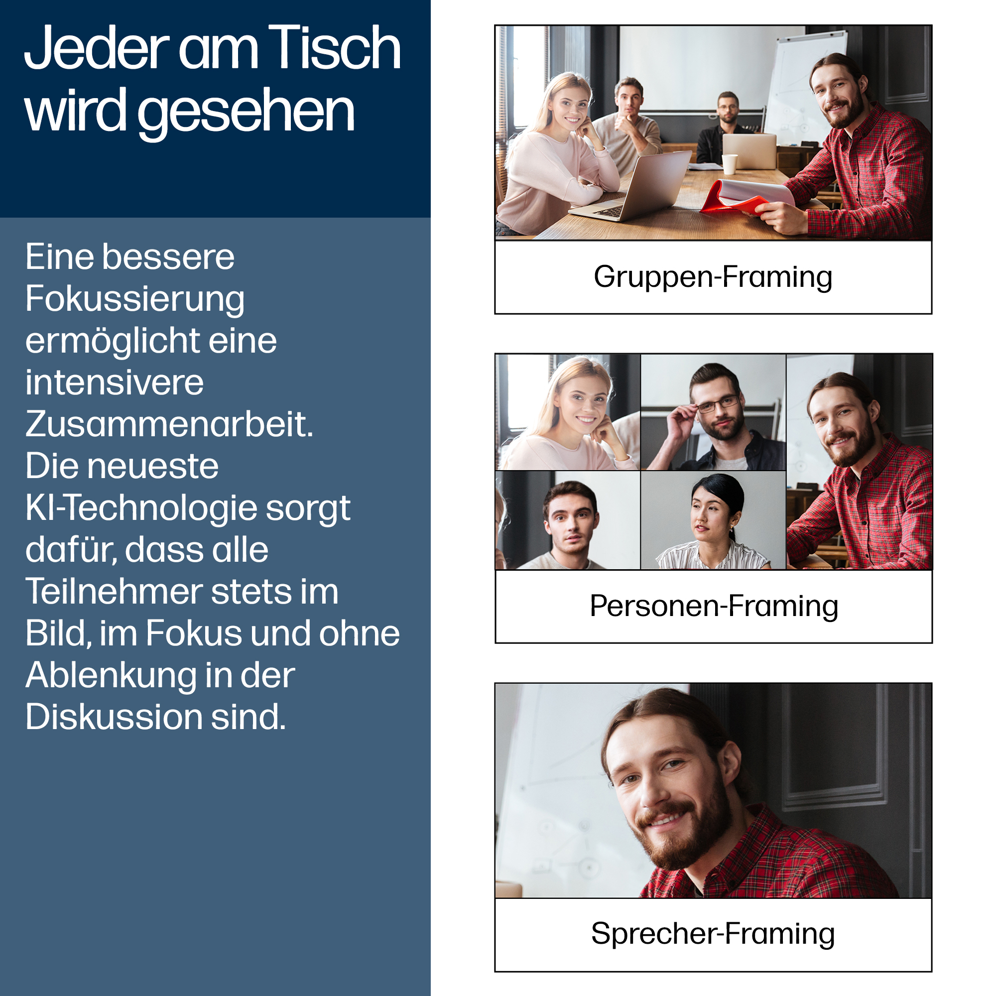 Je besser der Fokus, desto besser die Zusammenarbeit. KI-Technologie der neuesten Generation wie Poly DirectorAI setzt automatisch alle ins rechte Bild, rückt sie in den Fokus und bringt sie in den Mittelpunkt des Geschehens. Poly NoiseBlockAI und Acoustic Fence stellen gleichzeitig sicher, dass alle gehört werden und dass Störgeräusche außen vor bleiben.