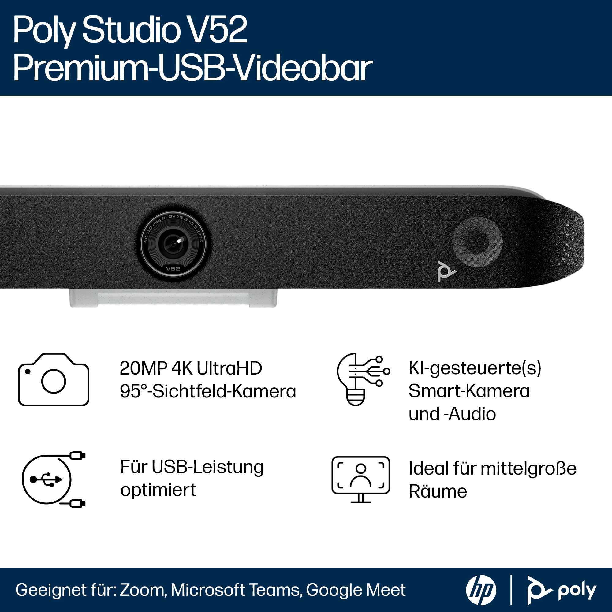 Dank der realitätsgetreuen Konferenzen für mittelgroße Räume haben Sie das Gefühl, als befänden sich alle im selben Raum. Die gestochen scharfe 4K-Kamera mit 20 MP und einem Sichtfeld von 95° sowie einem 5-fachen Zoom erfasst jedes Detail. Dazu liefern 4-Wege-Lautsprecher einen raumfüllenden Klang.