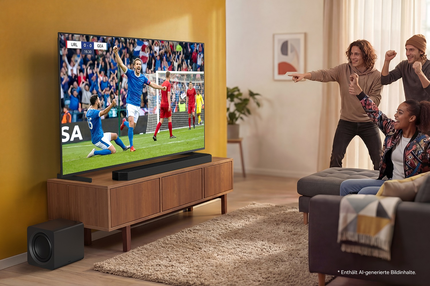 Erlebe TV-Lautsprecher und Soundbar in perfekter Harmonie dank Q-Symphony und AI.