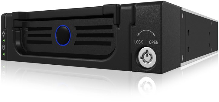 Der Wechselrahmen ist für die Verwendung von SATA Festplatten konzipiert. Der Anschluss erfolgt über den rückseitigen SATA Anschluss direkt am SATA Controller des Mainboards. Für die Kühlung der Festplatte sorgt das Vollaluminiumgehäuse mit dem frontseitigen Lüfter. Einen besonderen optischen Reiz bietet das "Blue Eye"-LED an der Frontseite des Einschubs.