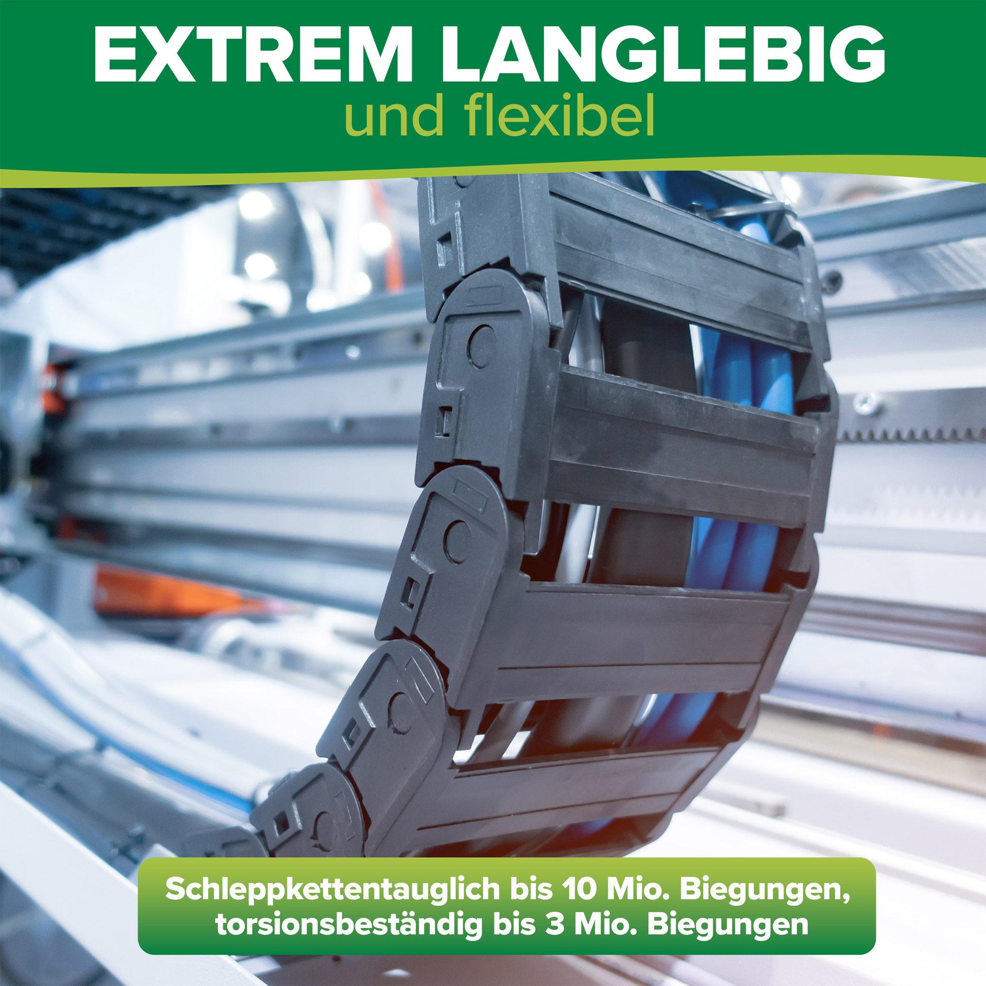 Die robuste Bauweise macht das Kabel schleppkettentauglich bis zu 10 Millionen Biegungen und torsionsbeständig bis zu 3 Millionen Biegungen.