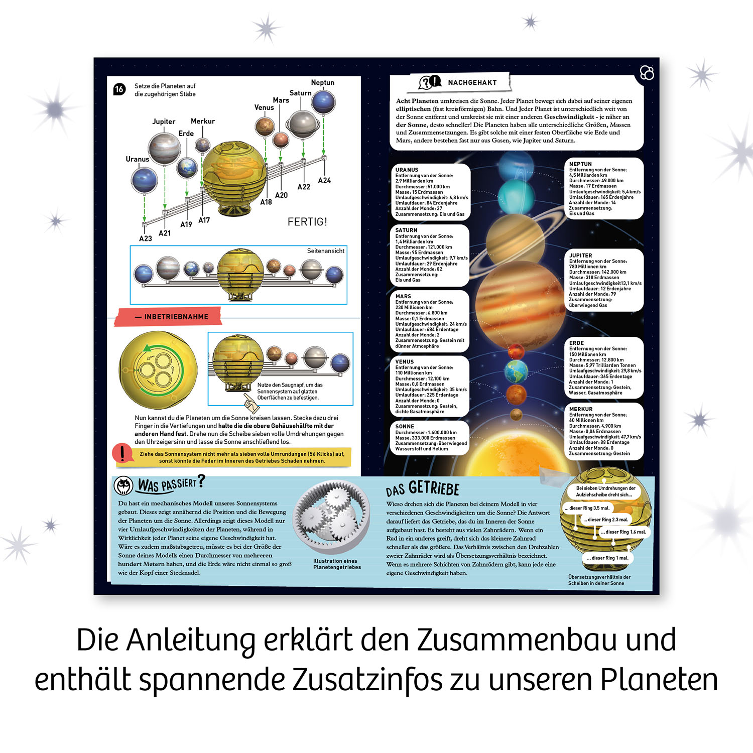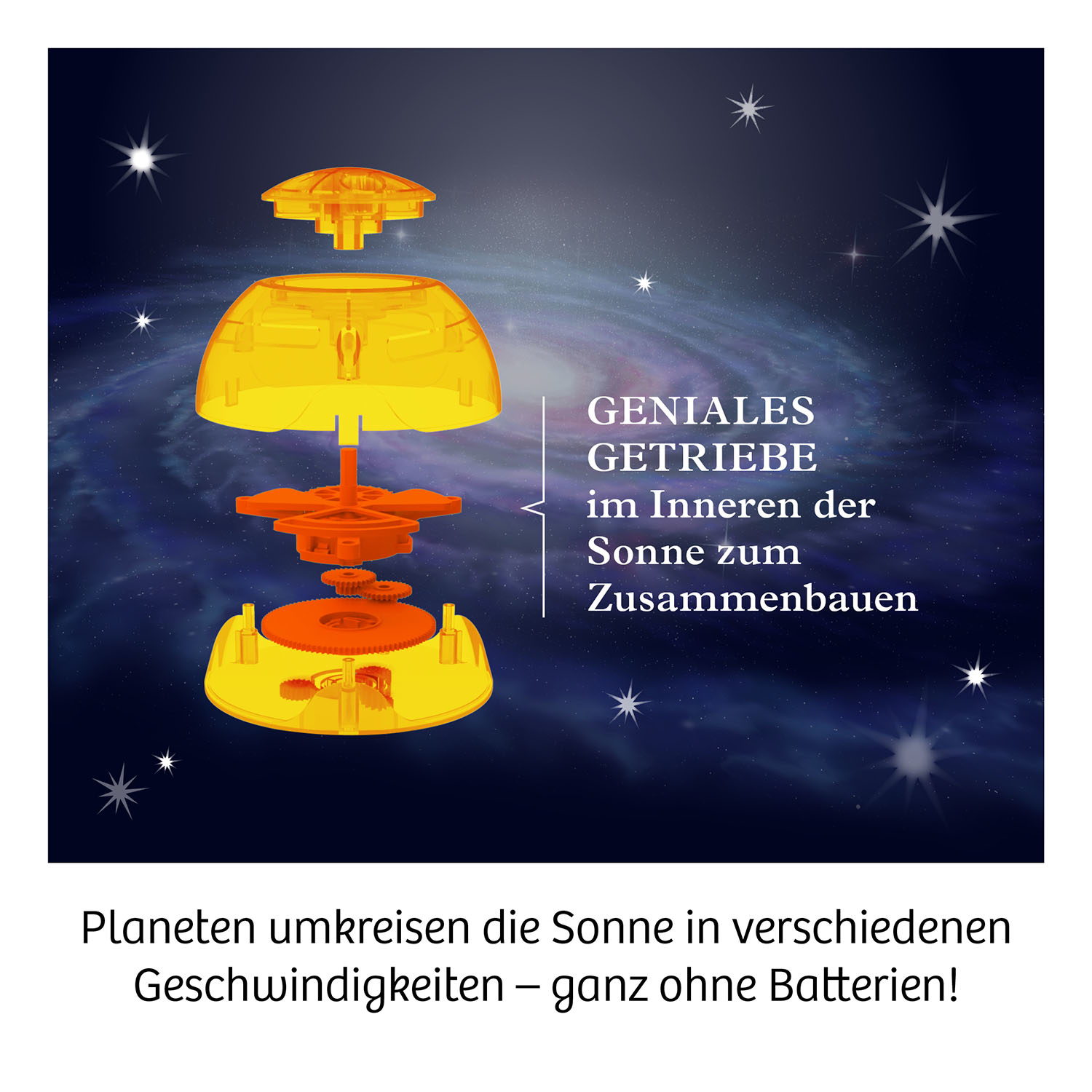 Die 8 Planeten kreisen um die Sonne, in der sich ein Aufziehmotor versteckt – das KOSMOS Sonnensystem funktioniert ganz ohne Elektronik und Batterie