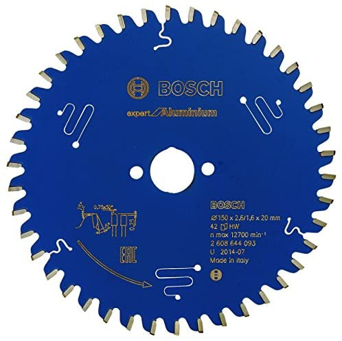 Kreissägeblatt Expert für Aluminium Das Expert für Aluminum Kreissägeblatt macht perfekte Schnitte in Aluminium. Einzigartige besonders harte Microteq-Zähne, die von Bosch intern produziert werden, werden aus sehr feinem Carbide-Korn hergestellt, wodurch die Lebensdauer und Leistung des Blatts maximiert wird. Diese Leistung wird durch die Schutzbeschichtung des Blatts unterstützt, die Korrosion verhindert und zuverlässiges Schneiden ermöglicht, während Reibung reduziert wird. Das Produkt ist mit Dämpfungsschlitzen für einen besonders ruhigen Lauf, deutlich weniger Geräusche und spürbar geringere Vibration ausgestattet. Verwenden Sie dieses Sägeblatt für Aluminium, Nichteisenmetalle, Kunststoff, Epoxidharz und Holz. Das Expert für Aluminium Kreissägeblatt verfügt über HLTCG-Zähne (High-Low Triple Chip Ground), wodurch das Blatt robust genug ist, um Aluminium zu schneiden. Außendurchmesser mm: 150, Bohrung mm: 20, Schnittbreite (b1) mm: 2,6, Stammblattstärke (b2) mm: 1,6, Schnittbreite (b1) mm / Stammblattstärke (b2) mm: 2,6/1,6, Zähnezahl: 42, ZahnForm: HLTCG, Max. Rotationsgeschwindigkeit (U/min): 12700, Schnittresultat: 4, NL/Durchmesser TKS: 2/6/32,5, Spanwinkel ° w1: -5, Freiwinkel ° w2: 15 - Breite: 19,5 cm, - Gewicht: 0,337 kg, - Höhe: 1,4 cm, - Länge: 23,2 cm, - Zähnezahl: 42, - Zahnform: HLTCG