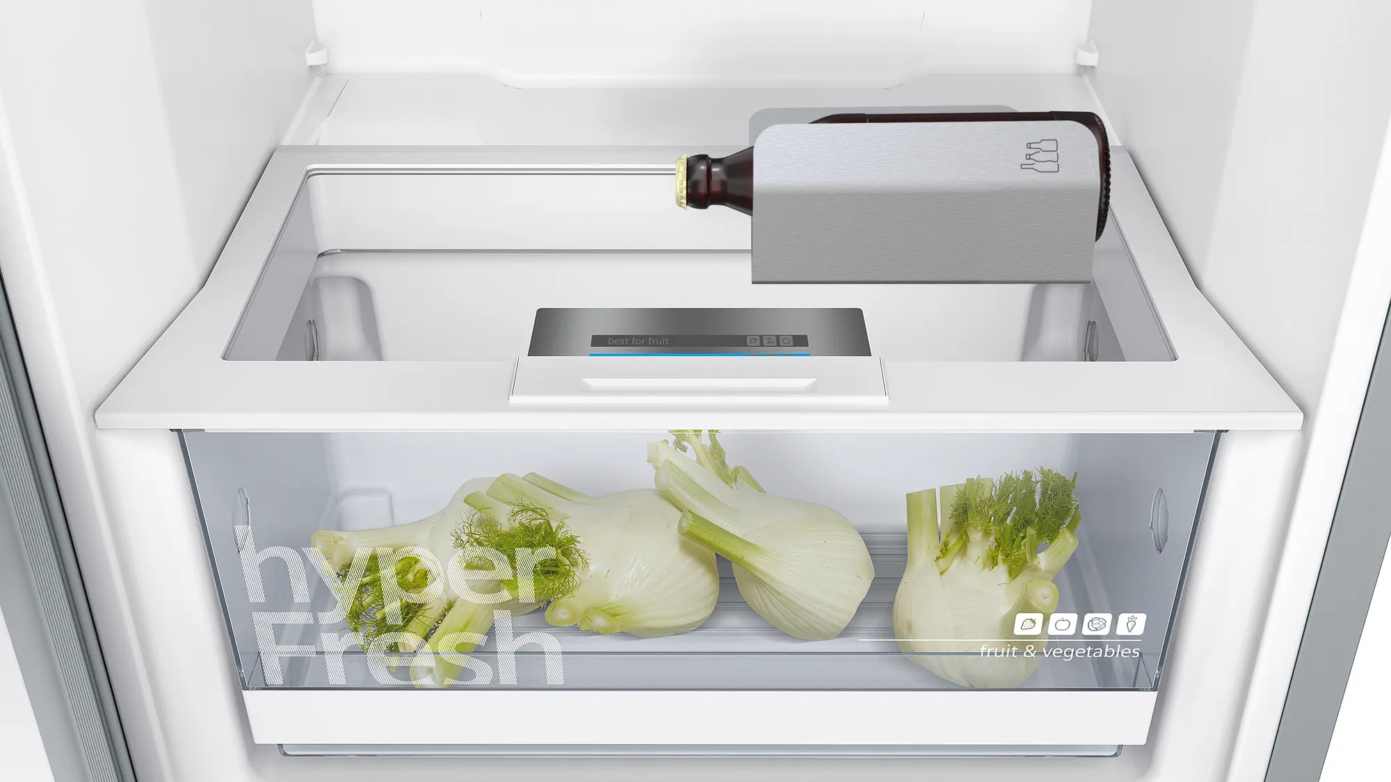 Gebürsteter Stahl antiFingerprint Solo-Kühlschränke 1-türig (> 90 cm H Leistung und Verbrauch Energieeffizienzklasse: D Energieverbrauch / Jahr: 93 kWh/a Geräuscheffizienzklasse / Geräusch-Wert: C / 39 dB Nutzinhalt gesamt: 346 l Design Vertikaler Stangengriff LED Beleuchtung Komfort und Sicherheit Elektronische Temperaturregelung über LED ablesbar freshSense - Konstante Temperatur durch intelligente Sensortechnik Super-Taste: superKühlen Kühlteil Nutzinhalt Kühlfächer: 346 l Optimale Kälteverteilung durch Innenventilator Abtau-Automatik im Kühlteil 7 Abstellflächen aus Sicherheitsglas davon 5 höhenverstellbar, 6 Glasplatten ausziehbar bottleCooler, verchromter Flaschenrost 5 Türabsteller, davon 1 Butter-/Käsefach Frischhaltesystem 1 hyperFresh Box - hält Obst und Gemüse länger frisch Maße Gerätemaße ( H x B x T): 186.0 cm x 60.0 cm x 65.0 cm Technische Informationen Höhenverstellbare Füße vorne, Rollen hinten Türöffnungswinkel 90° 220 - 240 V Klimaklasse: SN-T Länge des Anschlusskabel: 230 cm Zubehör 1 x Aufbewahrungsbehälter mit Deckel, 1 x Eierablage, 1 x Flaschenablage Wandabstandshalter Länderspezifische Optionen Auf Basis der Ergebnisse der Normprüfung über 24 Std. Tatsächlicher Verbrauch abhängig von Nutzung/Standort des Geräts.
