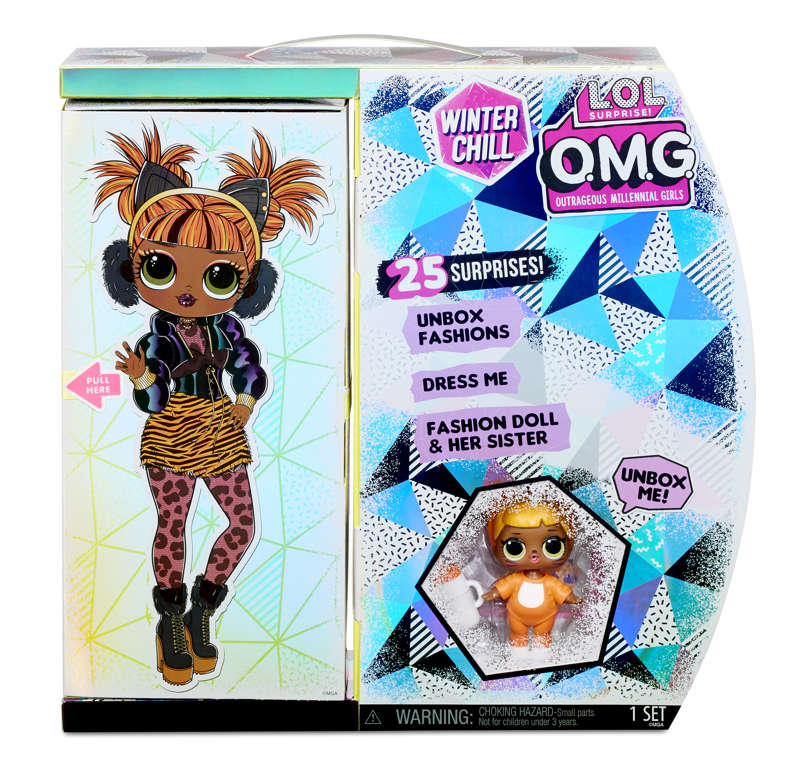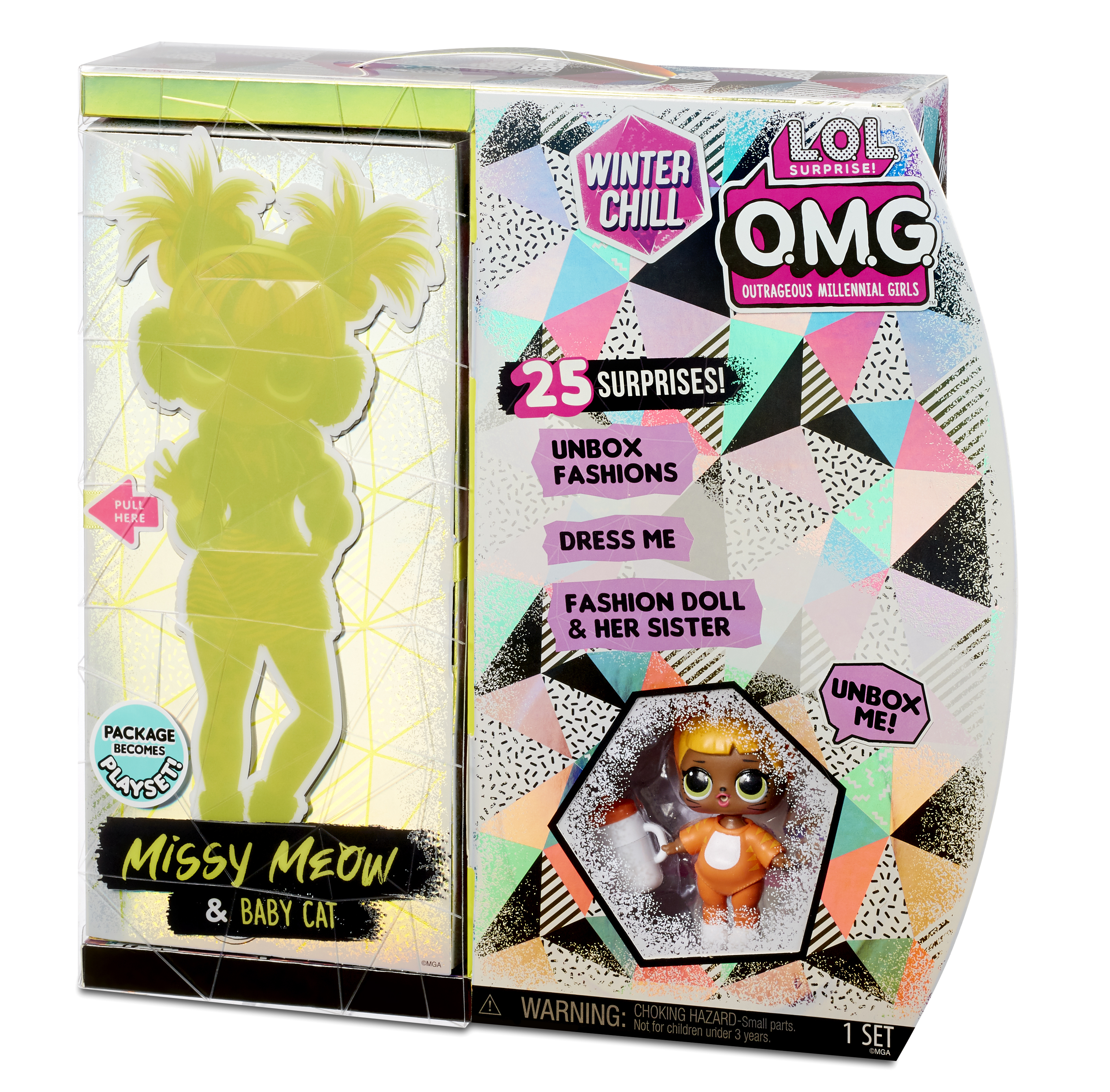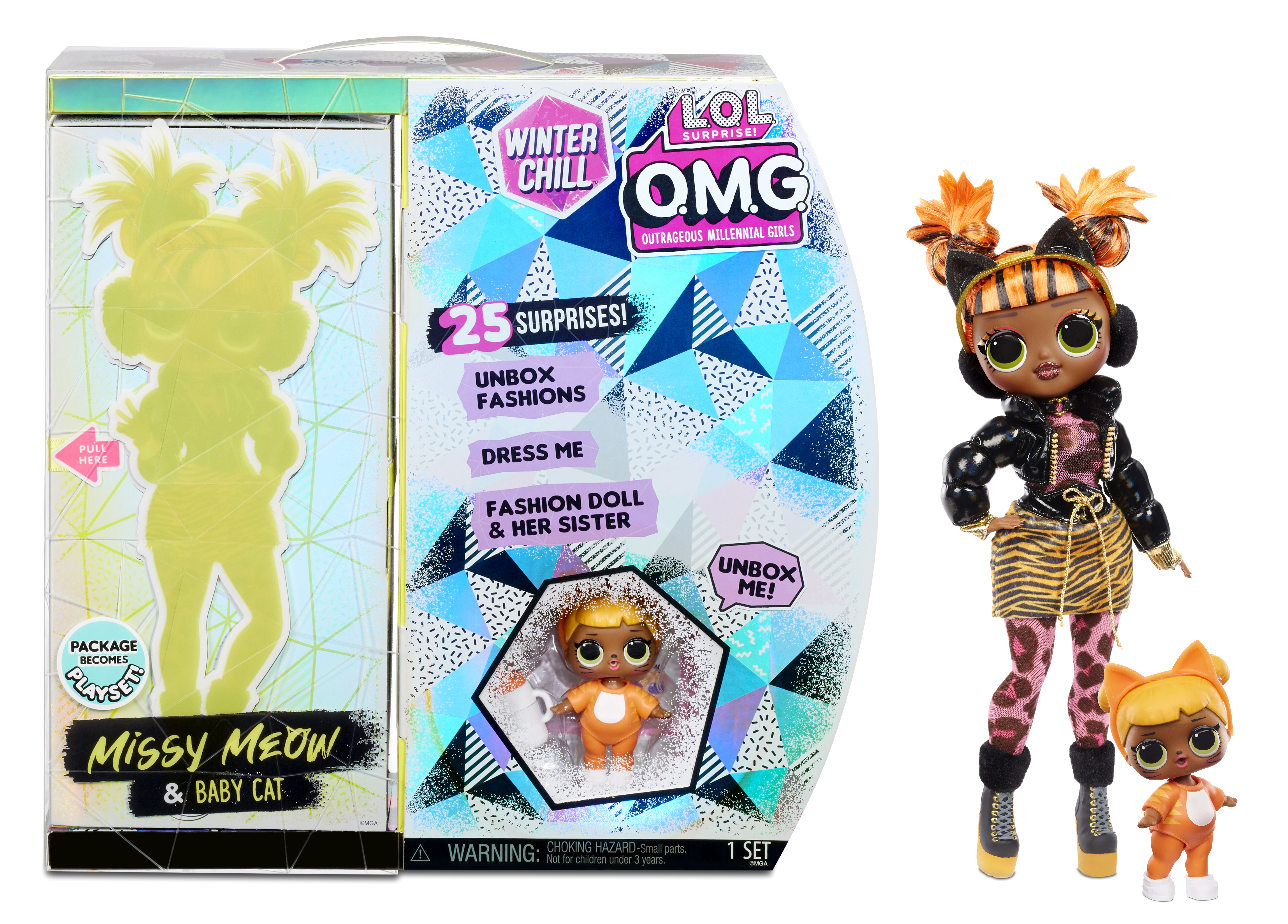 OMG Winter Chill Missy Meow und Baby Cat OMG Winter Chill Missy Meow und Baby Cat mit 25 Überraschungen Highlights Enthält zwei Puppen: O.M.G. Winter Wonderland Puppe und ihre kleine Schw