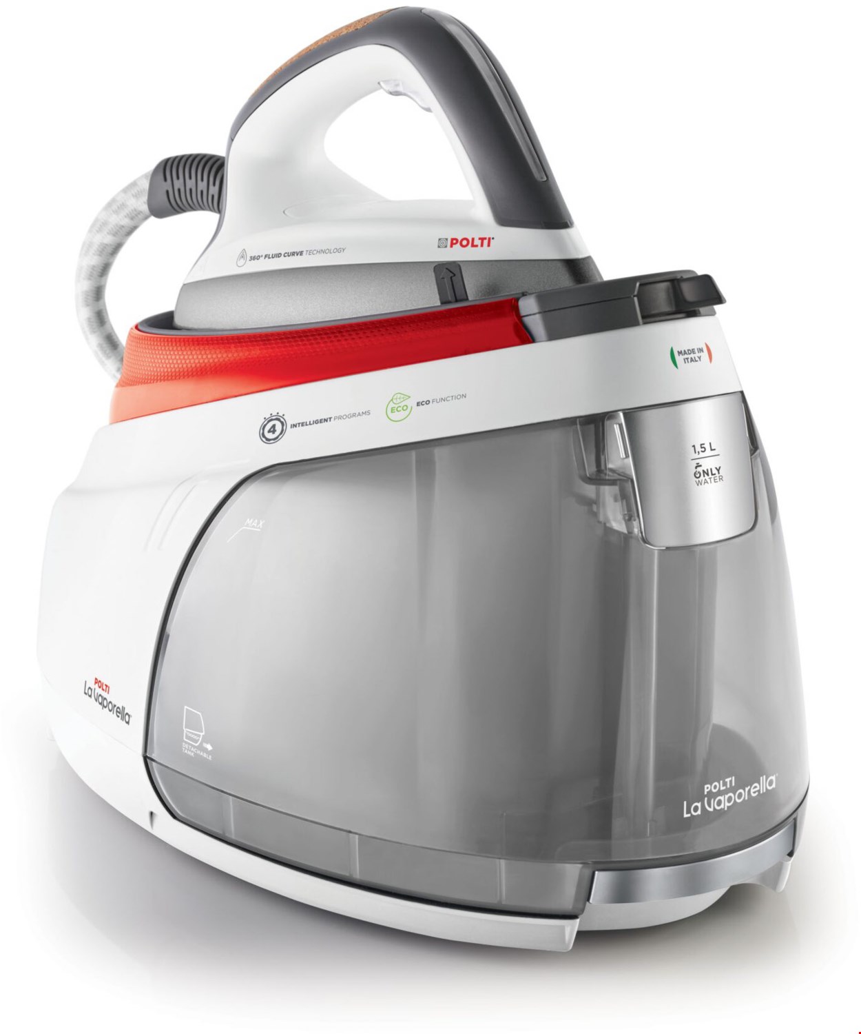 Perfektes Bügeln! Das multidirektionale Aluminium-Bügelsohle mit doppelter Keramikbeschichtung sorgt für perfekte Ergebnisse in einem Durchgang. Leistung für lange Einsätze Der Dampf aus dem 7,5 BAR Kessel ist kräftig und unbegrenzt. Der abnehmbare 1,5-Liter-Tank sorgt für lange Bügelsessions. Auf Turbo schalten Mit dem Turbo-Programm gibt der Hochdruck-Heizkessel einen kräftigen Dampfstrahl ab, der selbst die schwierigsten Falten glättet. Intervalldampf: maximaler Komfort Die Funktion Steam Pulse wird mit einem Doppelklick aktiviert: Der Dampf tritt automatisch in kurzen Abständen aus. 4 Bügelprogramme Ein cleveres Bügeleisen, dessen Kombination aus Temperatur und Dampfleistung automatisch je nach Programm eingestellt wird. Einmalige Handhabung Lege das Bügeleisen beim Bügeln auf die abnehmbare Bügelmatte, verriegele es und stecke das Kabel und den Schlauch in die Fächer.