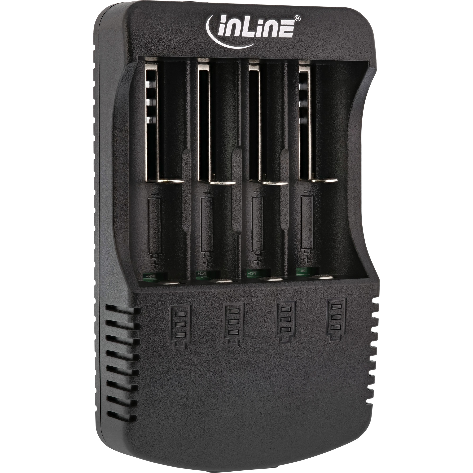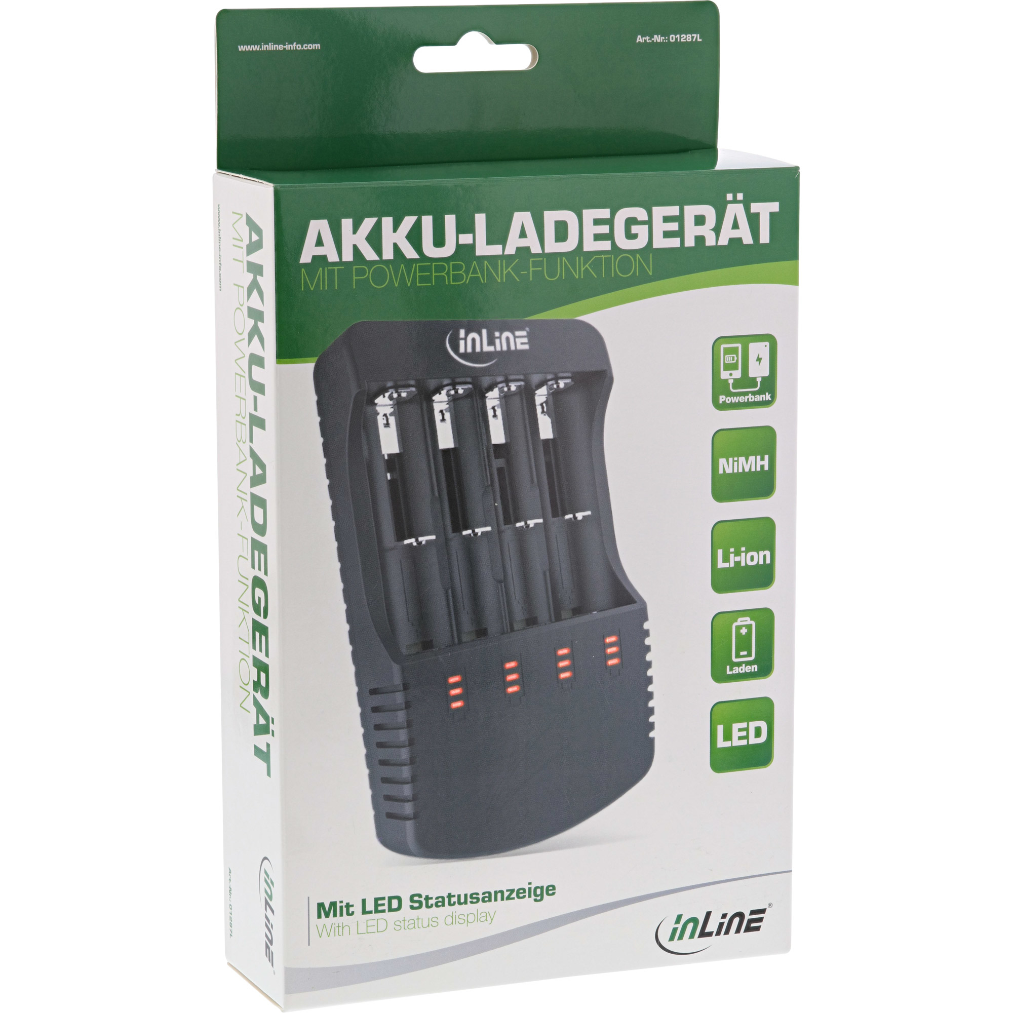 Das InLine® Akku-Ladegerät ist ausschließlich für NiCd/NiMH und Li-Ion Akkus geeignet und eine schnelle und einfache Lösung, um Ihre Akkus zu laden. Die LED-Statusanzeige zeigt Ihnen stets den Ladestand des Akkus an. Eingangsspannung: AC 100-240V, optional DC12V/1,5A Geeignet für: 4 Akkus NiMH, NiCd oder Li-Ion Ladestrom: bei Li-Ion 4.2V 500mA x4 bzw. 1000mA x2, bei NiMH/Cd: 1.48V 500mA x4 USB-Ausgang 5V/1A Powerbank-Funktion: Bis zu 2 Akkus in die Steckplätze 3 und 4 stecken und das Ladegerät als Powerbank über den USB-Ausgang (5V/1A) verwenden Schutz gegen Überladung, Überhitzung, Überspannung und Kurzschluss Aktueller Ladezustand jeder Batterie wird durch die Anzahl der leuchtenden LEDs angezeigt Ladevorgang wird automatisch gestoppt, wenn der Akku voll ist Leistung: 12W maximal Maße (LxBxH): 155x94x33mm Packungsinhalt: Ladegerät, Stomkabel und BedienungsanleitungFolgende Batterie-Formate werden unterstützt: 1.2V NiMH/NiCd Batterie: A, AA, AAA, AAAA, C, SC 3,7V Li-Ion Rundzelle: