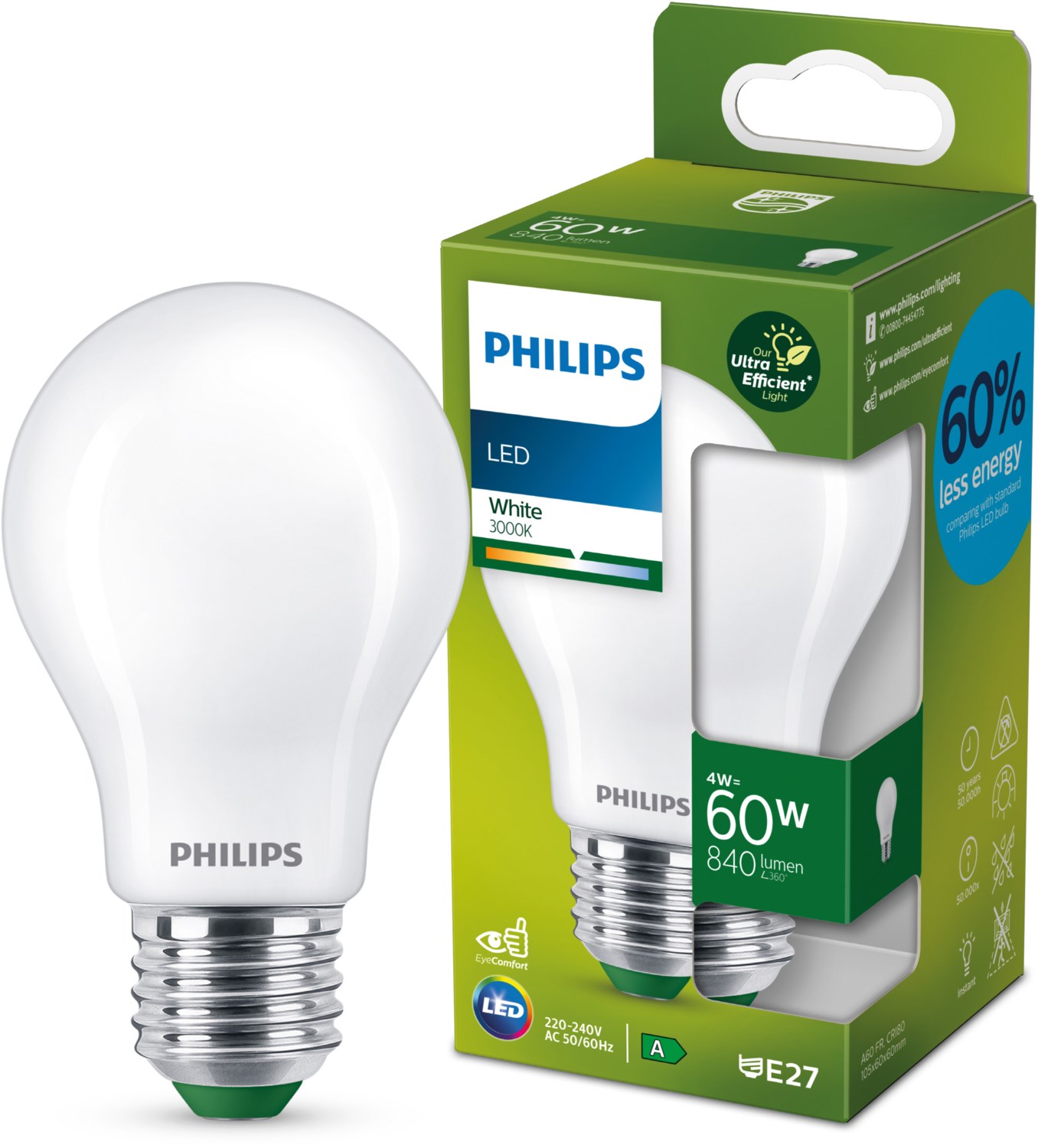 Philips Classic LED Lampe mit Energieeffizienzlabel A ersetzt 60W, E27 Sockel, matt, warmweiss (3000K), liefert nachhaltige and langlebige LED Beleuchtung. Die Lampen innerhalb dieser neuen hocheffizienten Produktkategorie halten 50 Jahre, ca. 3,5x so lange wie Standard-LED Lampen - für weniger Müll. Zudem sparen sie bis zu 60% Energie gegenüber herkömmlichen LED-Lampen. Dies führt zu einer niedrigeren Stromrechnung, geringeren CO2 Emmissionen und zu einem lebenswerteren Planeten. Immer mit dem EyeComfort Qualitaetsversprechen. Denn eine schlechte Lichtqualität kann die Gesundheit der Augen beeintraechtigen. Daher ist es wichtiger denn je, das eigene Zuhause richtig zu beleuchten. Philips LED-Lampen erfüllen strenge Prüfkriterien, um sicherzustellen, dass sie unseren Anforderungen an den Sehkomfort entsprechen.