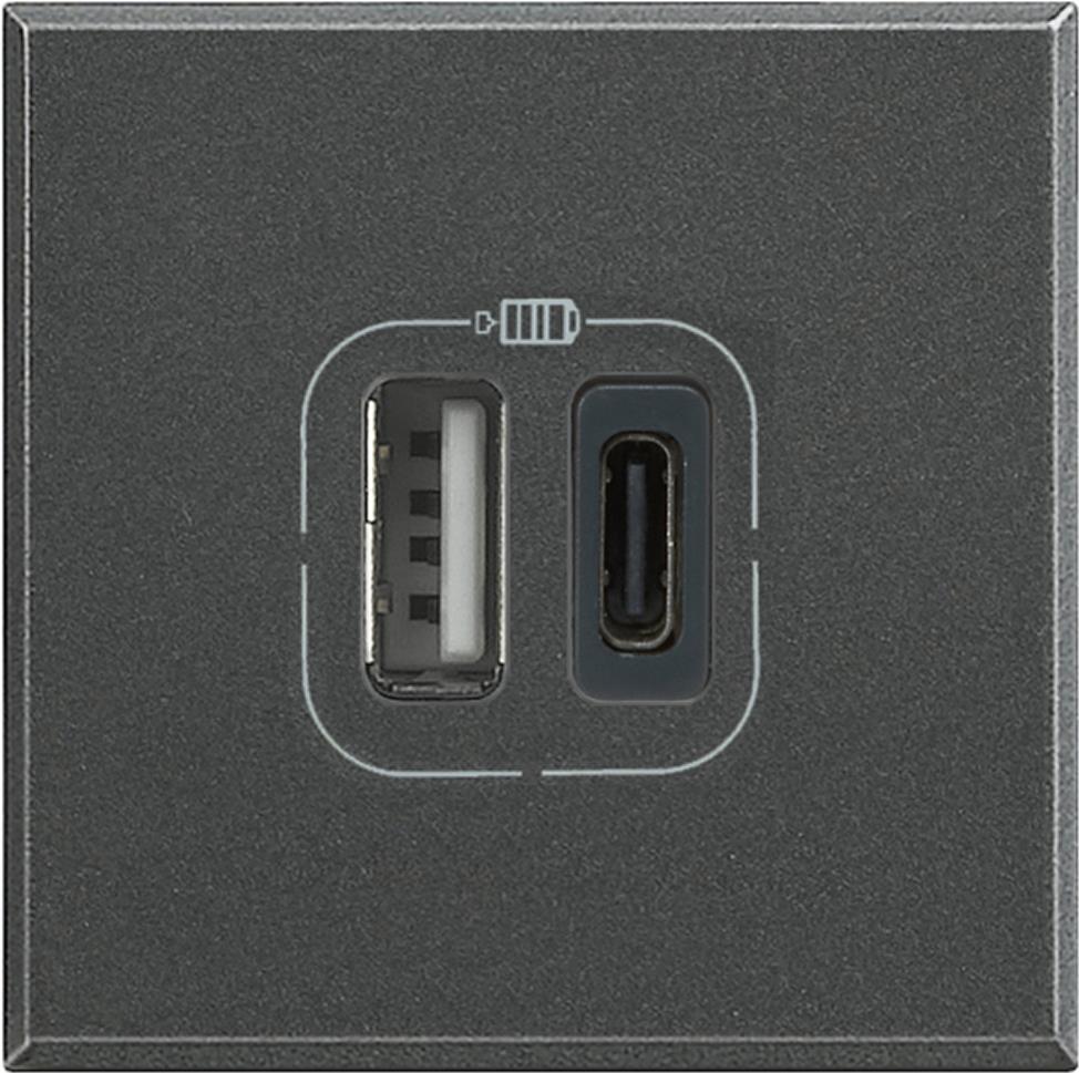 rnAxolute USB-Ladestation für Typ A und C in 2-moduliger Ausführung, 1500 mA Ladestrom pro Ausgang, 3000 mA für den Typ C bei alleiniger Verwendung, Farbe Anthrazitrnrn Hauptmerkmale rn rn Merkmale rn Buchsen-Typ 2x USB rn Anzahl Fassungen 2 rn rn Design rn Produktfarbe Anthrazit rn rn Leistung rn USB Ausgangsstrom 1,5 A rn