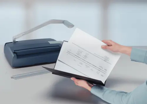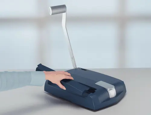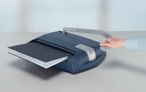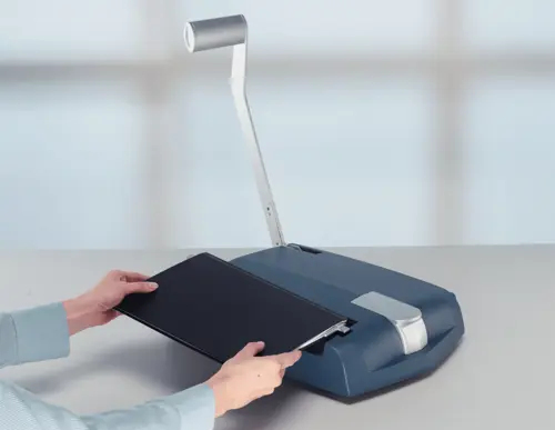 Entbinder für Buchbindegerät impressBIND 140; die Buchbindemappe kann leicht wieder geöffnet werden und Papier hinzugefügt, entfernt oder ausgetauscht werden;