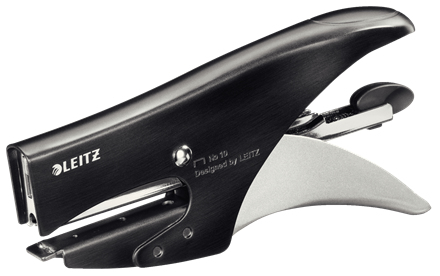 Leitz Kleine Heftzange Style, mit Hinterlademechanik, für geschlossene Heftung, mit gebürsteter Metall-Oberfläche und Silber als Kontrastfarbe; Heftleistung: 1,5 mm/15 Blatt; Heftklammern: 150 x Nr; 8 (6/4); Einlegetiefe: 49,5 mm; Material: Metall; Farbe: satin schwarz;