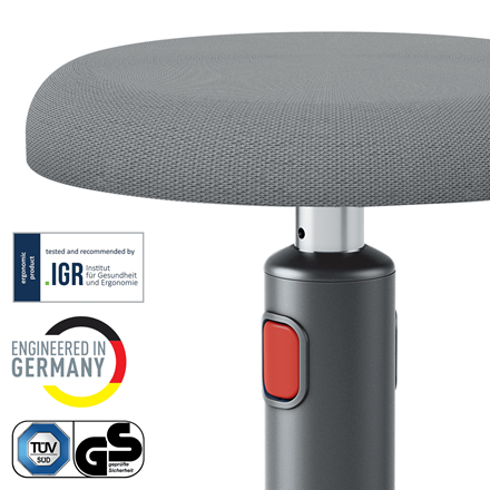 Leitz Aktiv Sitz-und Stehhocker Ergo Cosy; Mit ergonomischem Sitz; Stabil und standfest; Die abgerundete Standfläche regt zum Wippen und Schwenken an und um den Rücken zu stärken; Der Wechsel zwischen Sitzen und Stehen führt zu verbesserter Muskelaktivität und einer besseren Körperhaltung; Höhenverstellbar von 45 bis 79 cm; Mit rutschfester Unterfläche, um den Hocker zu sichern und den Boden zu schützen; Produkt und Verpackung ohne Plastik; Material: Metall/Schaumstoff, mit strapazierfähigem 3D-Luftnetz überzogen; Tragfähigkeit: bis zu 110 kg; Gewicht: 5,5 kg; Format: 370 x 690 x 370 mm; Farbe: grau;
