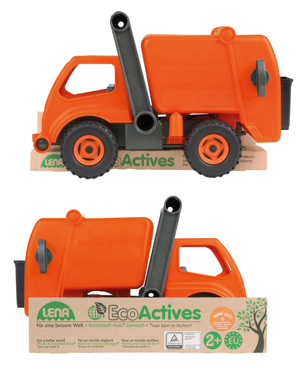 LENA EcoActives Müllwagen Sandfahrzeug rot Führerhaus zum Öffnen und Bespielen, verriegelbarer Müllbehälter mit Mülltonne und Hebel mit Kippfunktion Größe