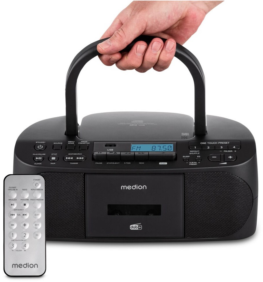 Portable Kompaktanlage Keine andere Geräteklasse eröffnet Dir so viele Möglichkeiten wie eine tragbare Stereo-Kompaktanlage: Das MEDION DRX-1 Plus spielt UKW-Radiosender, CDs, Kassetten und sogar die MP3-Dateien von Deinem USB-Stick. Über den zusätzlichen AUX-Eingang kannst Du eine beliebige weitere Musikquelle vom MP3-Spieler bis hin zum Smartphone anschließen. Es verfügt über fest verbaute Stereo-Lautsprecher mit hervorragendem Klang und lässt sich dank eines Tragebügels bequem überallhin mitnehmen. Mobil einsetzbar durch Batteriebetrieb Sowohl Zuhause als auch unterwegs steuerst Du deine kompakte Stereoanlage komfortabel über die beiliegende Fernbedienung. Damit du das transportfreundliche Leichtgewicht mit seinen rund 1,5 kg auch an Orten nutzen kannst, an denen keine Steckdose vorhanden ist, kann das Gerät mit Batterien² bestückt werden. Digitaler Radioempfang mit DAB+ DAB+ ermöglicht dir den Empfang zahlreicher Radiosender in rauschfreier Digitalqualität sowie die Anzeige vieler zusätzlicher Informationen. Bluetooth® 5.4 Höre deinen Lieblingslieder ganz bequem vom Tablet oder Smartphone. Genieße dabei eine stabile, kabellose Verbindung. Sechs Klangprofile Mit den sechs EQ-Profilen klingt deine Lieblingsmusik ganz nach deinen Vorstellungen. Wähle zwischen Bass, Flat, Rock, Pop, Klassik und Jazz für die optimale Klangeinstellung deiner Boombox. 40 Speicherplätze für Favoriten Damit Du die von Dir am meisten gehörten Radiosender sofort und ohne weiteres aufrufen kannst, ist ein umfangreicher Senderspeicher integriert. Hier kannst Du bis zu 40 Stationen auswählen, die Dir anschließend auf Knopfdruck zur Verfügung stehen. Flexible Wiedergabe Mit dem AUX-In-, USB- sowie dem Kopfhöreranschluss steht dir die volle Bandbreite unterschiedlicher Wiedergabemöglichkeiten zu Verfügung. Einfache Bedienung Die praktische Fernbedienung und einfache Bedienmöglichkeiten der Boombox geben dir die volle Kontrolle über Dein Gerät, sodass du sofort loslegen kannst. ¹ Die Kompatibilität zu allen im Handel erhältlichen Speichermedien kann nicht gewährleistet werden. ² Batterien nicht im Lieferumfang