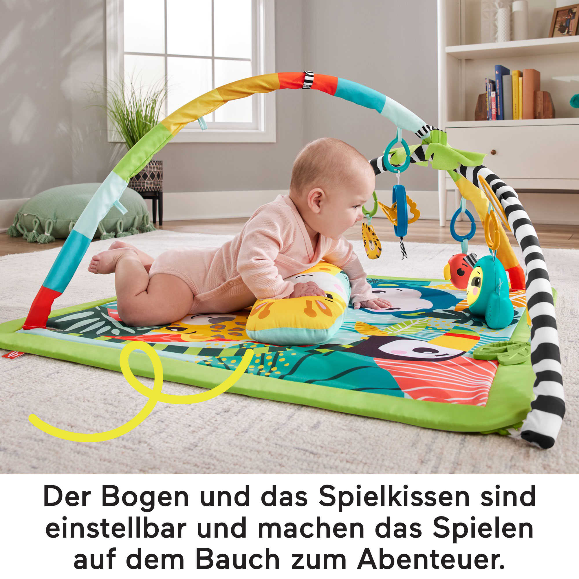Spielen in der Bauchlage: Der anpassbare, kontrastreich gemusterte Bogen kann neu positioniert werden, um das Spielzeug in Sichtweite zu bringen, während das stützende Giraffen-Spielkissen dafür sorgt, dass das Baby bequem liegt