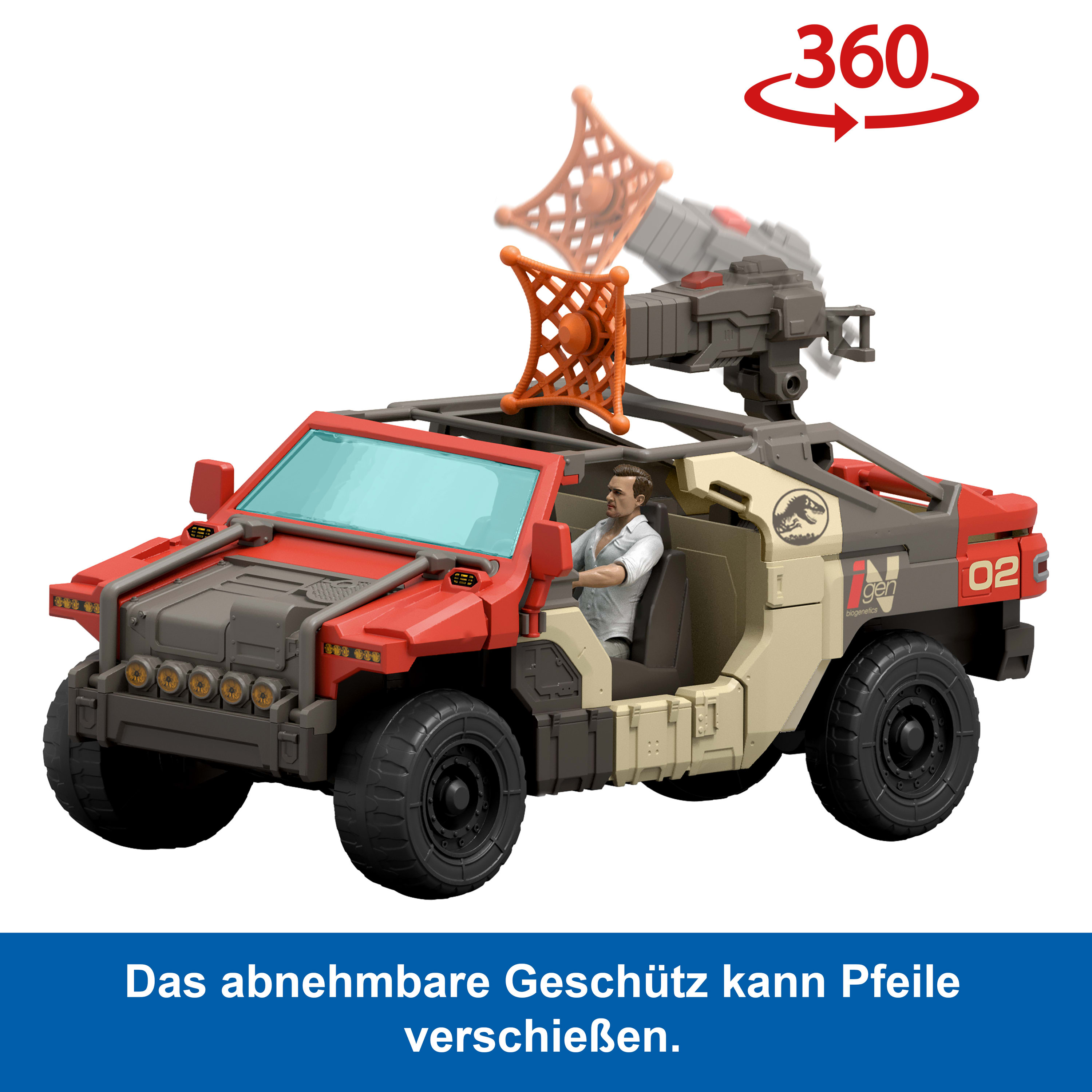 Bereit für Abenteuer! Mit dem Launch N Battle-Fahrzeug mit seinem abnehmbaren Starter und 2 unterschiedlichen Projektilen einem Pfeil und einem Fangnetz kann der packende Nervenkitzel von Jurassic World: Die Wiedergeburt nachgespielt werden!