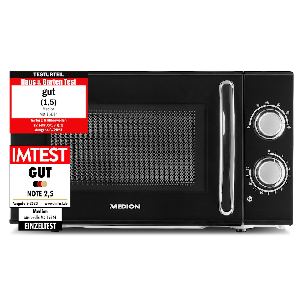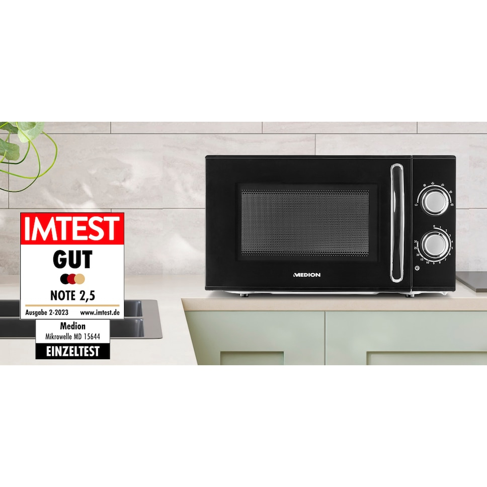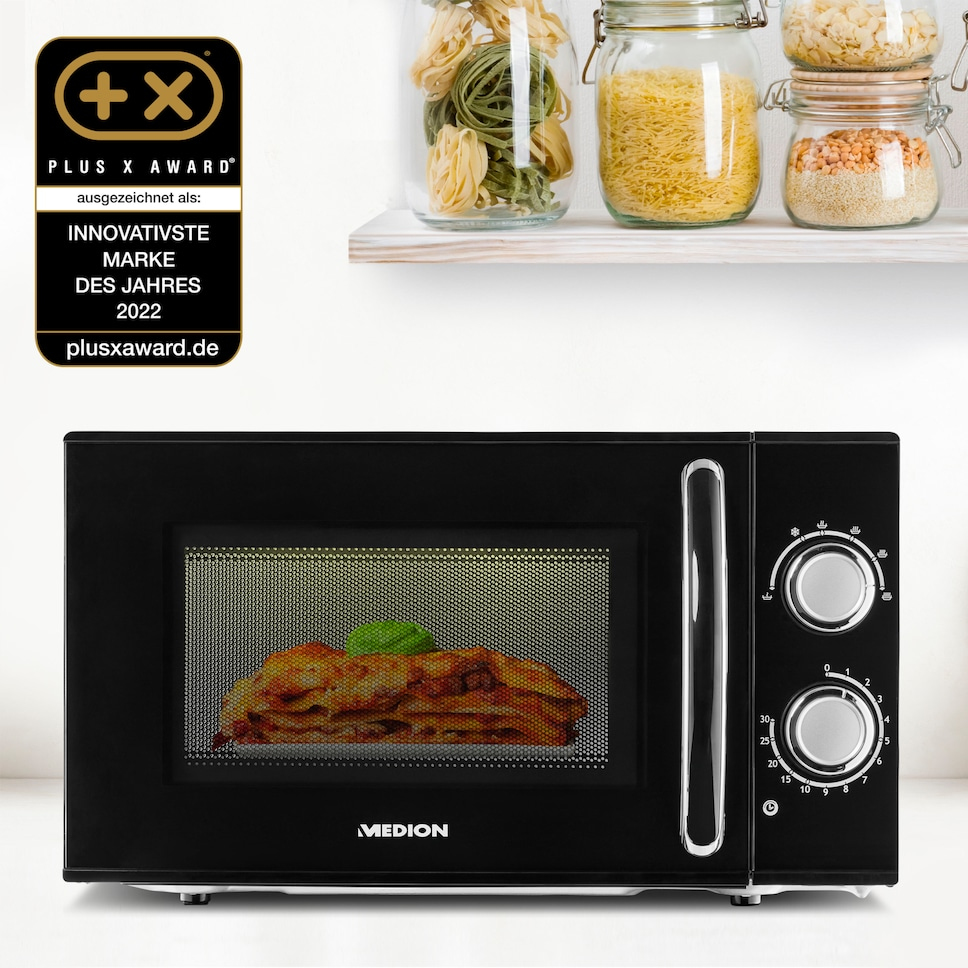 rnIn jeder Küche zuhauseHeiße Snacks, leckere Mahlzeiten und warme Getränke gelingen Dir mühelos mit der Mikrowelle von MEDION. Die 17 Liter Fassungsvermögen reichen für gängiges Gefriergut oder Mahlzeiten für zwei Personen. Erhitze Nudeln, Kartoffeln, Suppen, Eintöpfe oder Fertiggerichte schnell und auf den Punkt dank 700 Watt Leistung.Praktisch, flexibel, effizientDie sechs Leistungsstufen bieten Dir Flexibilität bei der Zubereitung und sorgen für rundum optimale Ergebnisse. Mit der Auftaufunktion taust Du tiefgekühlte Nahrungsmittel schnell und schonend auf und verarbeitest sie direkt weiter. Ein Timer mit bis zu 30 Minuten Laufzeit signalisiert zuverlässig, wann Dein Essen heiß ist. Dieser Küchenhelfer sollte in keinem Haushalt fehlen.EDELSTAHLFRONT UND WEISS LACKIERTER INNENRAUIm besten Fall funktionieren Küchengeräte nicht nur, sondern sind obendrein auch noch möglichst leicht zu reinigen. Durch die Edelstahlfront und den weiß lackierten Innenraum entspricht die Mikrowelle diesen