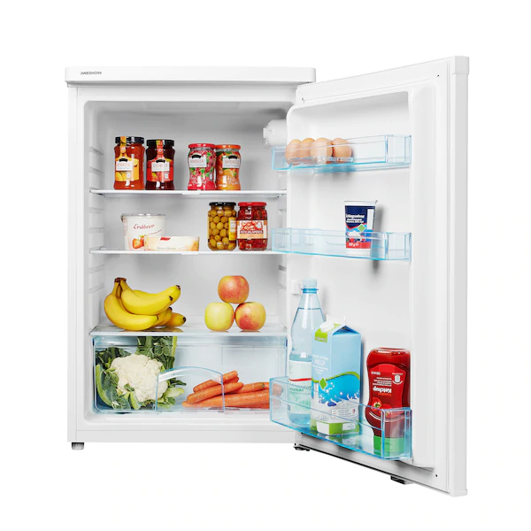 MEDION Tisch-Vollraumkühlschrank »MD13854« Farbe: Weiß Maße: B x H x T ca. 55 x 85 x 58 cm Inhalt: Inkl. Eierablage Gewicht: Ca. 27 kg Füllmenge: Ca. 130 l Technische Details: Nutzinhalt ca. 130 l Geräuschpegel 39 dB Energieverbrauch 112 kWh/Jahr Klimaklasse N/ST Türanschlag wechselbar Höhenverstellbare Füße Innenbeleuchtung 2 Glas-Einlegeböden 1 transparente Gemüseschublade mit Glasabdeckung Manuelle Temperatureinstellung Manuelle Abtaufunktion Eingelassener Türgriff Freistehend Sonstige Hinweise: Garantiegeber: Medion AG, Am Zehnthof 77, 45307 Essen Herstellergarantie: 2 Jahre Garantieumfang: auf Material- oder Herstellerfehler Räumlicher Geltungsbereich: Deutschland Hersteller-Artikel-Nummer: 50066317 Nutzbares Volumen ca. 130 l – einfaches Kühlhalten verschiedener LebensmittelEnergieeffizienzklasse F (von A bis G)Geräuschpegel 39 dBTüranschlag wechselbarHöhenverstellbare FüßeInnenbeleuchtung2 Glas-Einlegeböden und transparente Gemüseschublade mit GlasabdeckungTemperatureinstellung und Abtaufunktion manuellEingelassener TürgriffFreistehendKompakte Maße – ideal auch für kleinere Küchen