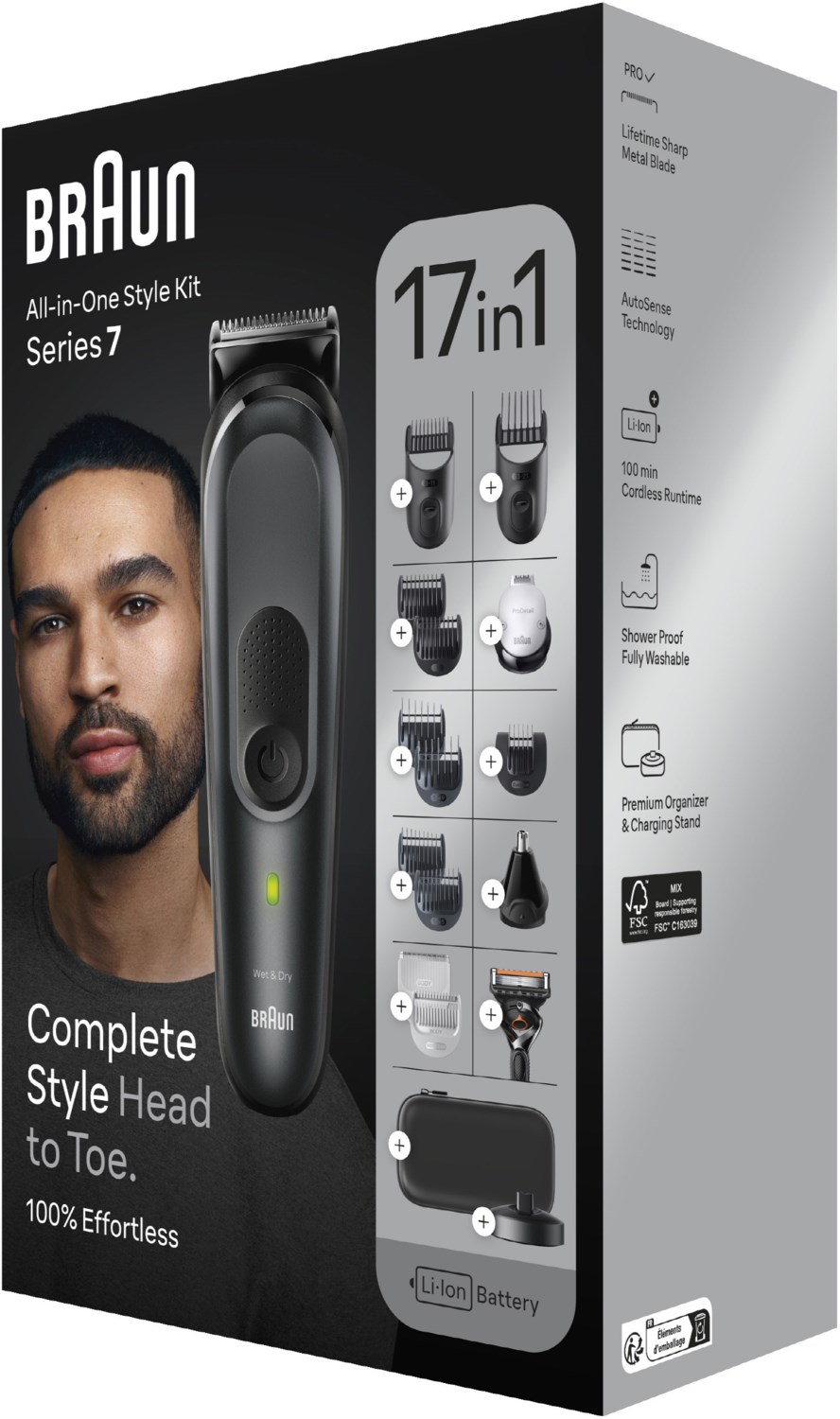 Körperpflege von Kopf bis Fuß mit dem Braun All-In-One Styling Set Series 7. Körperpflege Set für Barthaar, Kopfhaar, Details und Bodygrooming. Das Bartpflege und Bodygroomer Set für Herren bietet Barttrimmer, Haarschneider, Haarschneidemaschine in einem und ist als Geschenk für den Mann ideal geeignet. Mit der schärfsten Pro-Klinge von Braun, AutoSense-Technologie und 100 Minuten Laufzeit.