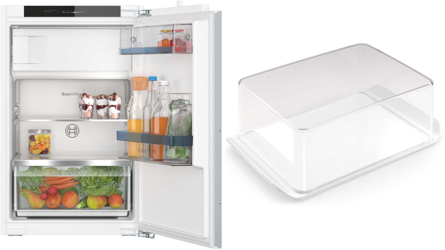 Einbau Kühlschrank easy Installation Flachscharnier, Leistung und Verbrauch Energieeffizienzklasse: E Nutzinhalt gesamt: 119 l Nutzinhalt Kühlfächer: 104 l Energieverbrauch / Jahr: 144 kWh/a Klimaklasse: SN-ST Geräuscheffizienzklasse / Geräusch-Wert: B / 35 dB Design LED Beleuchtung Komfort und Sicherheit Elektronische Temperaturregelung über LED ablesbar SuperKühlen SuperGefrieren: ja Kühlteil 2 Abstellflächen aus Sicherheitsglas, davon 1 höhenverstellbar 1 durchgehender Türabsteller 2 Türabsteller Frischhaltesystem MultiBox: transparente Schublade mit Wellenboden, ideal zur Lagerung von Obst und Gemüse Gefrierteil 1 Gefrierfach mit Klappe Nutzinhalt Tiefkühlfächer: 15 l Lagerzeit bei Störung : 10 h Gefriervermögen in 24 Std.: 3 kg Maße Gerätemaße ( H x B x T): 87.4 cm x 54.1 cm x 54.8 cm Nischenmaße (H x B x T): 88.0 cm x 56.0 cm x 55.0 cm Technische Informationen Länge des Anschlusskabel: 230 cm 220 - 240 V Zubehör 1 x Eiswürfelschale Länderspezifische Optionen Auf Basis der Ergebnisse der Normprüfung über 24 Std. Tatsächlicher Verbrauch abhängig von Nutzung/Standort des Geräts.
