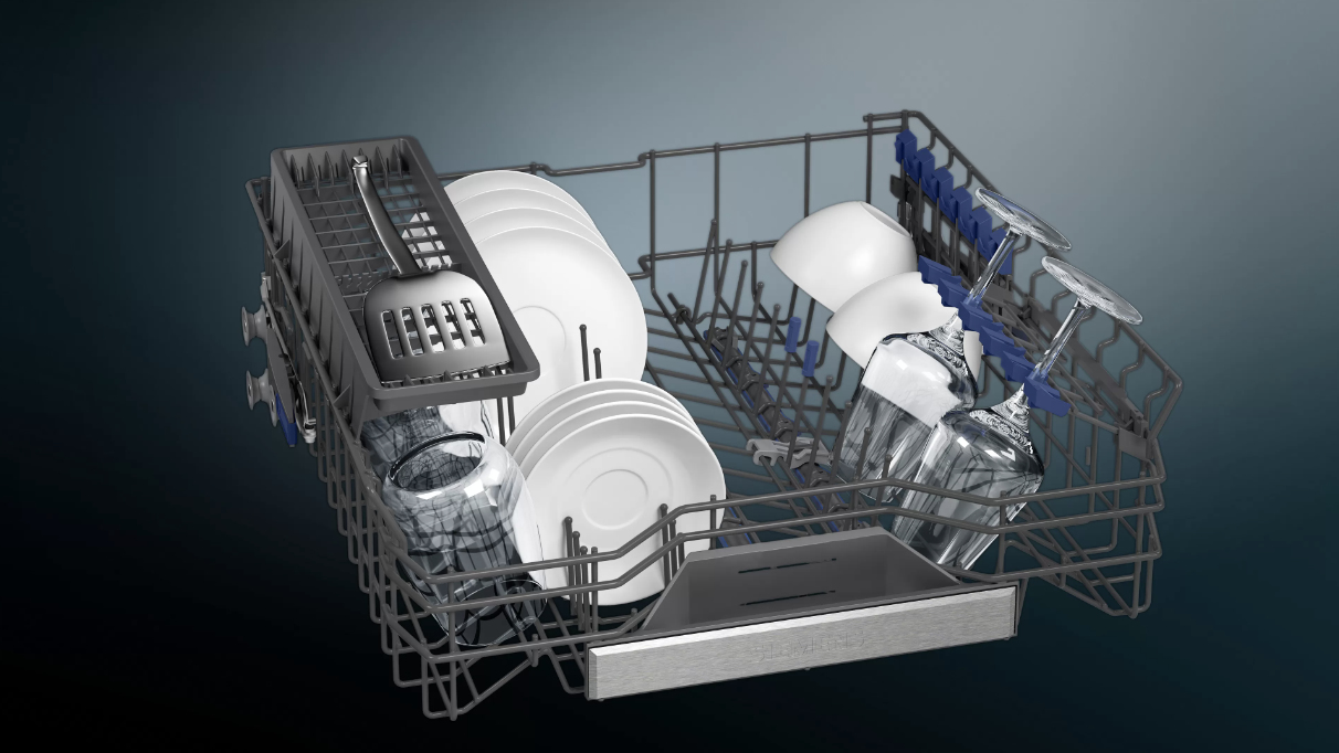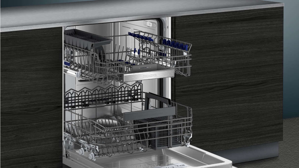 Spülmaschine MKSV6TNCB1 von Siemens Der Einbau-Geschirrspüler (60 cm) MKSV6TNCB1 ist von Siemens. Mit einem Betriebsgeräusch von 43 dB arbeitet die Siemens MKSV6TNCB1 außerordentlich leise. Für 3 bis 4 Personen ist das höhenverstellbare Gerät mit einer Kapazität von 13 Standardgedecken ideal. Funktionen und Programme Zur Verfügung stehen bei dieser Spülmaschine 6 Programme. Sparen Sie Ressourcen und damit Kosten mit den Energiespar-Programmen. Muss es fix gehen, dann profitieren Sie vom Kurz-Programm. Benötigt Ihr Geschirr wegen starker Verschmutzung eine gründlichere Reinigung, stellt dies dank des Intensiv-Programms kein Problem dar. Lästiges Reinigen entfällt bei der Siemens MKSV6TNCB1, denn die Spülmaschine hat ein eigenes Programm dafür. Zu den Optionen der Siemens MKSV6TNCB1 zählen auch das Gläser-Programm und das Vorspül-Programm. Welches Programm ist wohl am geeignetsten? Stellen Sie sich diese Frage, nutzen Sie am besten das Automatik-Programm, denn hier wird alles präzise auf die Teller, Tassen und Töpfe abgestimmt. Der Wasserverbrauch passt sich automatisch an. In den Programmen reichen die Temperaturen von 40 bis 70 Grad. Der Einbau-Geschirrspüler verfügt zudem über folgende Eigenschaften Gut eingeräumt ist fast gespült: So finden zum Beispiel Teller und Tassen dank des klappbaren Tellereinsatzes, der Gläserhalter und 4 Tassenauflagen einen sicheren Platz. Wenn Sie große Töpfe haben, ist der nach unten und oben verstellbare Oberkorb äußerst praktisch – dies ist sogar in befülltem Zustand möglich. Milchige Gläser? Nicht mit der eingebauten Wasserenthärtung. Die Startzeitvorwahl lässt Sie die Hausarbeit zeiteffizienter erledigen. Auf dem Display werden nützliche Informationen wie die Restzeit angezeigt. Die Siemens MKSV6TNCB1 verhilft Ihnen jedes Mal zu einem perfekten Ergebnis, da eine elektrische Salz-Nachfüllanzeige Sie rechtzeitig erinnert, wenn etwas fehlt. Das Modell trägt die Energieeffizienzklasse B. Der Wasser-Stopp bietet ein Plus an Sicherheit. Unsere Kaufempfehlung Was Sie suchen, ist ein Geschirrspüler, der über eine Wasser-Sicherung verfügt und sich selbst reinigt? Mit der Siemens MKSV6TNCB1 machen Sie alles richtig.