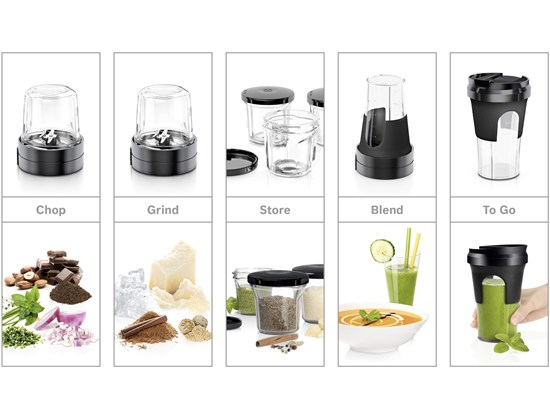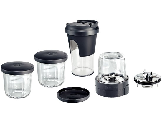 5-in-1 Zubehörset zum Mixen, Mahlen, Hacken, Aufbewahren und mit ToGo-Lösung Enthält 3 Glasgefäße zum Mahlen und Zerkleinern, mit Deckeln zum luftdichten Aufbewahren Mahlfunktion zum Verarbeiten harter Lebensmittel wie Kaffeebohnen, Hartkäse, Getreide, Gewürzen oder Eiswürfeln Zerkleinererfunktion für sekundenschnelles Hacken von Kräutern, Nüssen, Zwiebeln oder Knoblauch Jedes Glasgefäß kann mit einem Deckel verschlossen werden um verarbeitete Lebensmittel aufzubewahren Kunststoff-Becher zum Mixen von Getränken und Smoothies sowie zum Pürieren von Suppen Mit dem ToGo-Deckel wird aus dem Mixbecher ein praktischer Behälter in dem Getränke problemlos mitgenommen werden können
