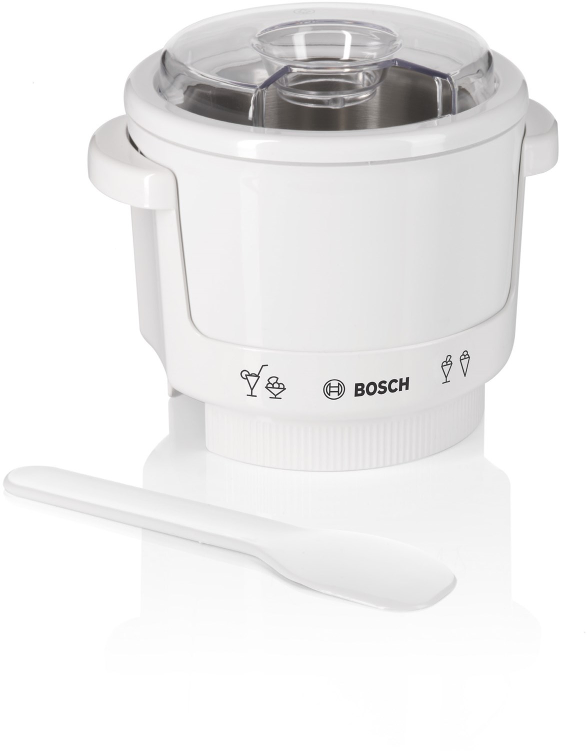 1 doppelwandiger Kühlbehälter, max. 550 g Eis pro Behälter und Arbeitsgang, Rührwerkzeug mit Sicherheitskupplung, Halterung für Kühlbehälter mit Griffrand, Spritzschutzdeckel mit Einfüllöffnung, Spatel, Maße (HxBxT): 18 x 18 x 18 cm.