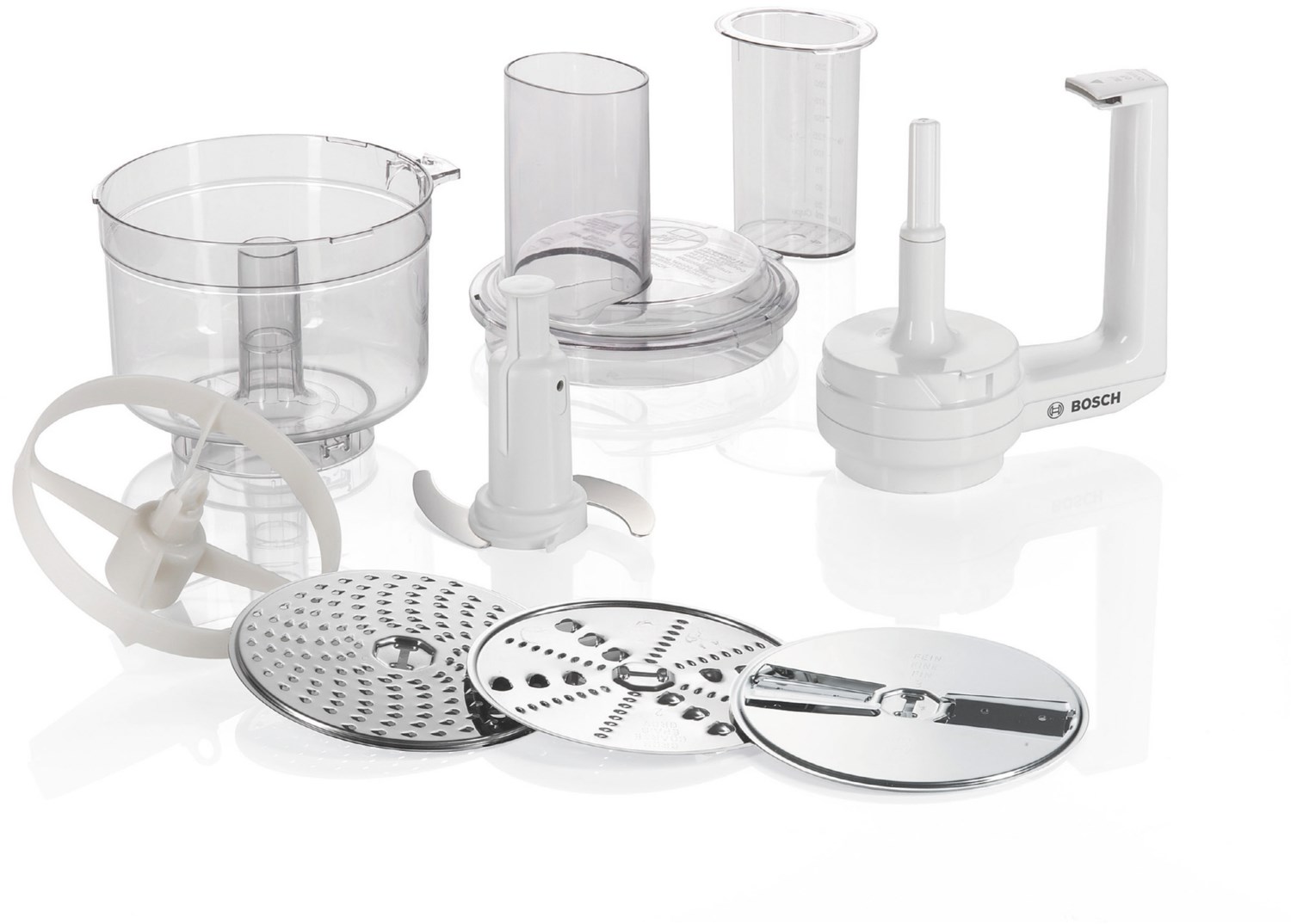 Schlagmesser, Schneid-Wendescheibe, Raspel-Wendescheibe und Reibscheibe mittelfein (=5 Funktionen), Scheibenträger Scheiben und Schlagmesser aus Edelstahl Deckel mit Einfüllhilfe und Stopfer Auch zum Zerkleinern von Eiswürfeln und gefrorenem Obst und Gemüse geeignet Fassungsvermögen 0.5 l Hohe Sicherheit durch Deckelverriegelung