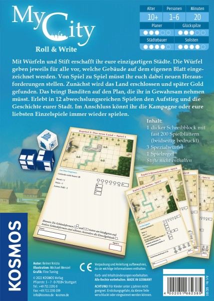 In diesem Würfelspiel erschaffen die 1-6 Spielerinnen und Spieler über 4 Kapitel mit je 3 Spielen ihre einzigartige Stadt. Beim Bauen gilt es, immer neue Herausforderungen zu meistern. Die Würfel geben jeweils für alle vor, welches Gebäude mit einem Stift auf dem eigenen Blatt eingezeichnet wird. Spannendes Gesellschaftsspiel ab 10 Jahren, in dem die eigene Stadt von Spiel zu Spiel wächst und wächst! Inhalt: 1 dicker Schreibblock mit fast 200 Spielblättern (beidseitig bedruckt) 3 Spezialwürfel 1 Spielregel>