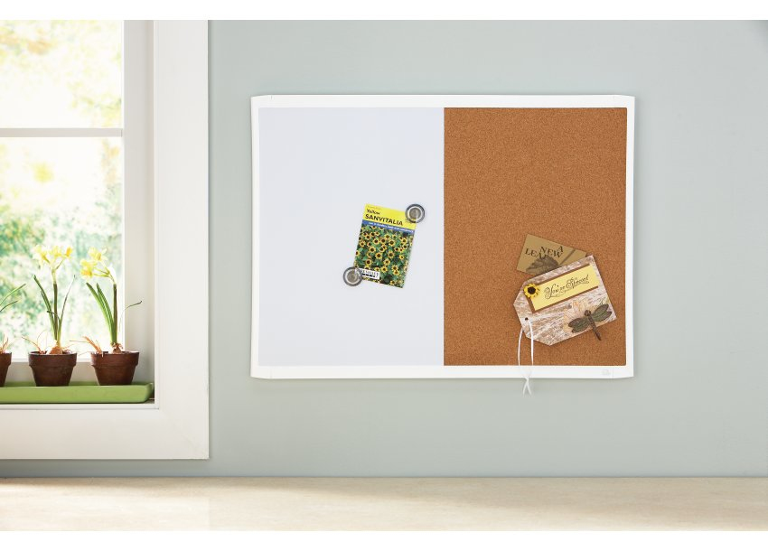 Nobo Kombitafel, magnetisch/Kork; Montage im Quer-oder Hochformat möglich; Korkoberfläche: Für die Verwendung von Pinnwandnadeln; Weißwandoberfläche: Magnetisch, beschreibbar; Gute Löscheigenschaften, gute Widerstandsfähigkeit gegen Farbflecken, Stifteflecken, Kratzer und Dellen; Verdeckte Aufhängung; Lieferung inklusive Montageset, einem magnethaftenden Marker mit Wischer und zwei Magneten; Reinigung: trocken; Oberfläche/Material: lackierter Stahl und gepresster Naturkork; Rahmen: Aluminium; Format: 585 x 430 mm; Farbe: kork/weiß;