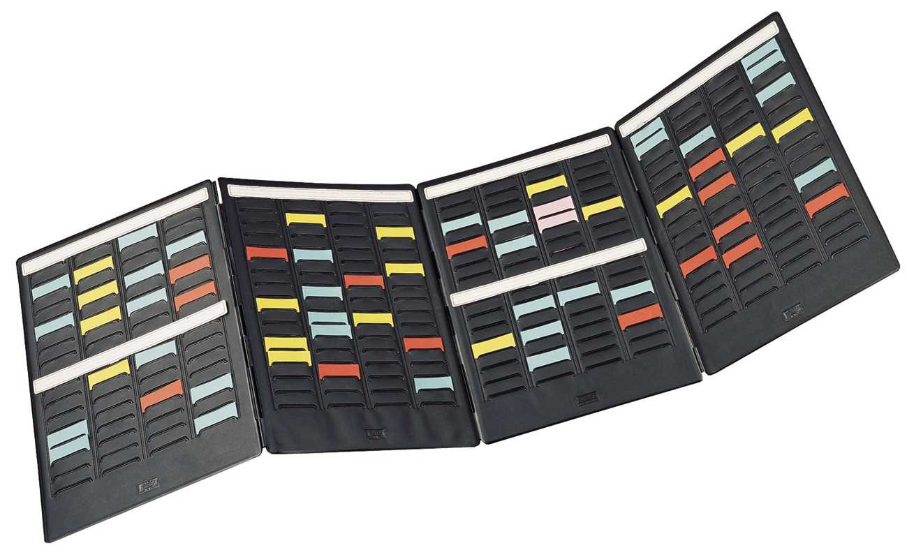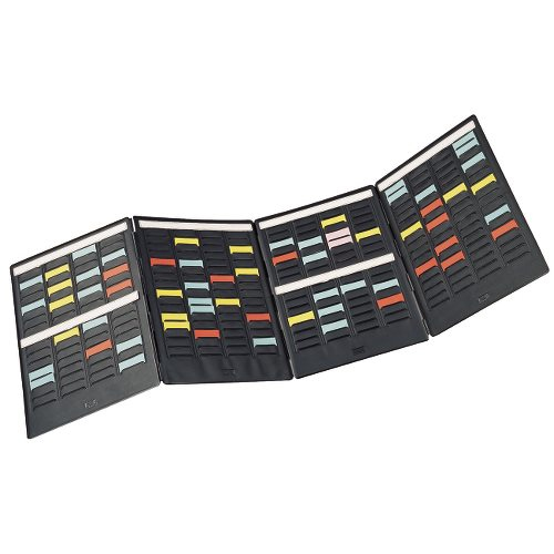 Nobo Mini Planer Set für T-Karten, 4-teilig; Für T-Karten Gr. 1,5; Jedes Element mit 4 Spalten und 17 Fächern; Mit Leporello-Faltung; Kann durch zusätzliche Erweiterungselemente vergrößert werden; Kapazität: 272 T-Karten; 4 Kartenträger mit je 17 Schlitzen für T-Karten Gr. 1,5; Lieferung inklusive 10 x 100 farbig sortierte T-Karten Gr. 1,5; Material: PVC, schwarz; Format: 240 x 315 mm;