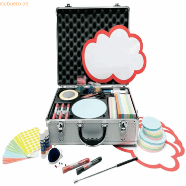 Nobo Moderationskoffer Business, Aluminiumkoffer mit Tragegriff; Inhalt: 2827 Teile; Bestehend aus: 5 x Moderationskarte Wolke 42x25 cm, 500 x Moderationskarte Rechteck 20,5x9,5 cm sortiert, 200 Moderationskarte Oval 19x11 cm sortiert, 200 x Moderationskarte Kreis Durchmesser9,5cm sortiert, 150 x Moderationskarte Kreis Durchmesser14cm sortiert, 150 x Moderationskarte Kreis Durchmesser18,5cm sortiert, 1200 Klebepunkte Durchmesser19mm je 300 Stück in gelb/rot//blau/grün, 10 Marker in rot/schwarz, 4 Jumbo-Marker in rot, blau/grün/schwarz, 400 Moderationsnadeln in gelb/rot/blau/grün, 1 Nadelkissen mit Clip, 2 Klebestifte, 1 Papierschere, 1 Kreppband 30mm x 50mm, 1 Teleskopzeigestab ausziebar bis 62,5cm, 1 Handabroller mit Klebefilm 19mm x 25m, 1 Cutter Klingenbreite 9mm;