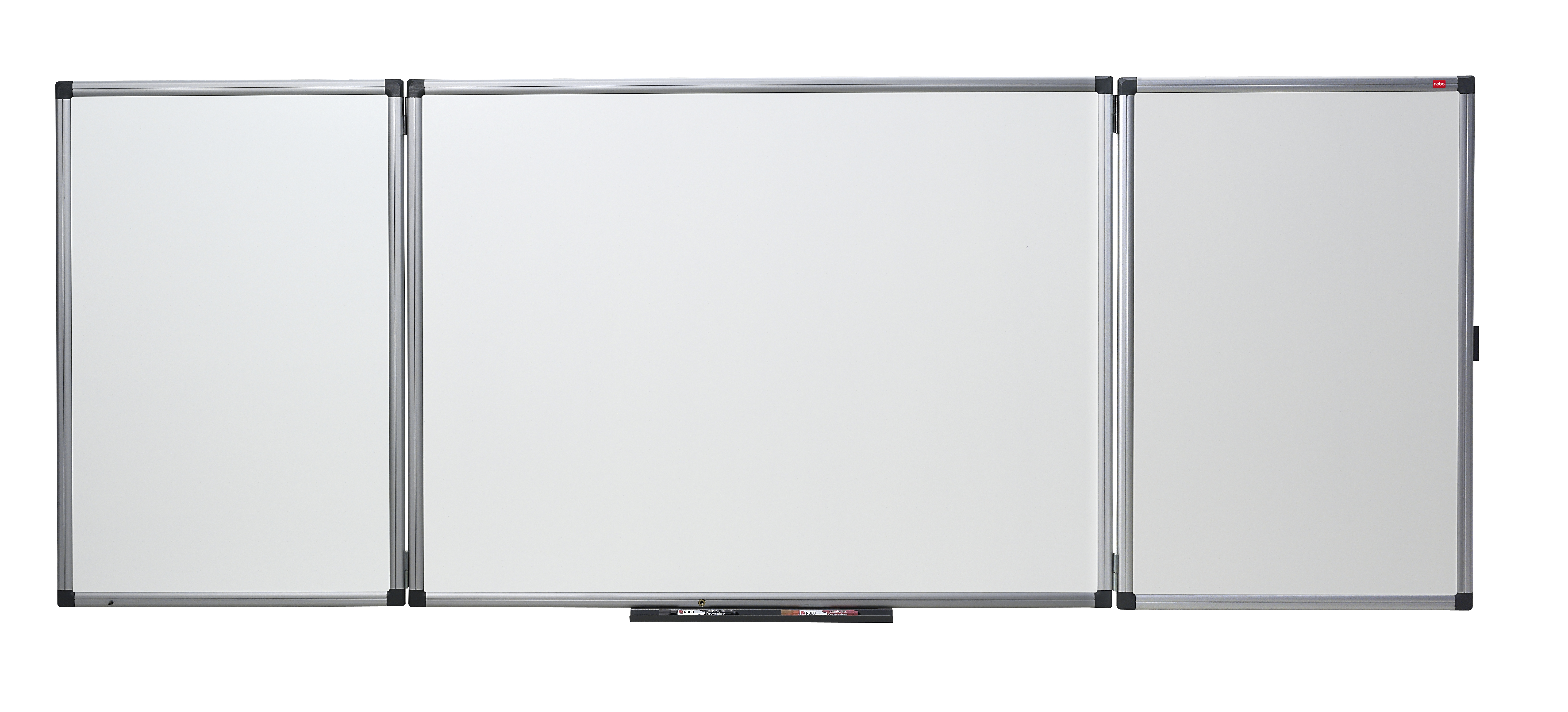 Nobo Weißwandtafel klappbar, magnetisch; Mit zwei ausklappbaren Seitenteilen; Mit 5 Schreibflächen; Überragende Löscheigenschaften; Höchste Widerstandsfähigkeit gegen Farbflecken, Stifteflecken, Kratzer und Dellen; Mit Stifteablage aus Aluminium; Verdeckte Aufhängung; Lieferung inklusive Montageset; Reinigung: trocken/feucht; Oberfläche/Material: Emaille; Rahmen: Aluminium; Format: 2000 x 1200 mm; Farbe: weiß;