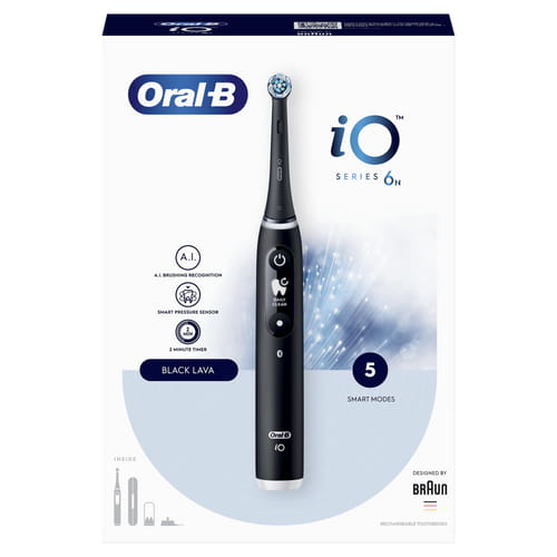 Oral-B Elektrische Zahnbürste iO Serie 6, 1 St. – erstklassige Mundpflege mit StilDie Oral-B iO Serie 6 Black Lava bietet Ihnen eine fortschrittliche Zahnreinigung, die auf modernster Technologie basiert. Diese elektrische Zahnbürste kombiniert innovative Funktionen mit einem eleganten Design, um Ihre Zahnpflege zu optimieren.Überlegene Reinigung durch MikrovibrationDie Oral-B iO Serie 6 Black Lava nutzt Mikrovibrationen, um Ihre Zähne gründlich und sanft zu reinigen. Diese Technik sorgt dafür, dass Plaque effektiv entfernt wird, während das Zahnfleisch geschont bleibt. Die sanften Vibrationen helfen, auch schwer erreichbare Stellen zu reinigen und verbessern so Ihre Mundhygiene.Intelligente Funktionen für eine individuelle ReinigungMit der eingebauten künstlichen Intelligenz bietet Ihnen die iO Serie 6 personalisiertes Coaching in Echtzeit. Das interaktive Display liefert Ihnen sofortiges Feedback und unterstützt Sie dabei, die richtige Putztechnik zu verwenden. Die Zahnbürste erinnert Sie zudem regelmäßig daran, den Bürstenkopf zu wechseln, um eine optimale Reinigungsleistung zu gewährleisten.Komfortabler Akkubetrieb und praktische ExtrasDie Zahnbürste arbeitet im Akkubetrieb, was Ihnen eine flexible Nutzung ohne störende Kabel ermöglicht. Im Lieferumfang enthalten sind das Handstück mit Aufsteckbürste, Ladestation, Mini-Etui für Aufsteckbürsten sowie ein Reiseetui. Diese praktischen Extras machen die iO Serie 6 Black Lava ideal für die tägliche Anwendung und auf Reisen.Elegantes Design und benutzerfreundliche BedienungDas edle Design in Black Lava verleiht der Zahnbürste eine moderne und stilvolle Optik, die sich nahtlos in jedes Badezimmer einfügt. Die benutzerfreundliche Bedienung durch das interaktive Display sorgt dafür, dass Sie Ihre Zahnpflege ganz einfach an Ihre Bedürfnisse anpassen können.Verbessern Sie Ihre Zahnpflege mit der Oral-B iO Serie 6 und genießen Sie die Vorteile einer intelligenten, effektiven Reinigung. Bestellen Sie jetzt!